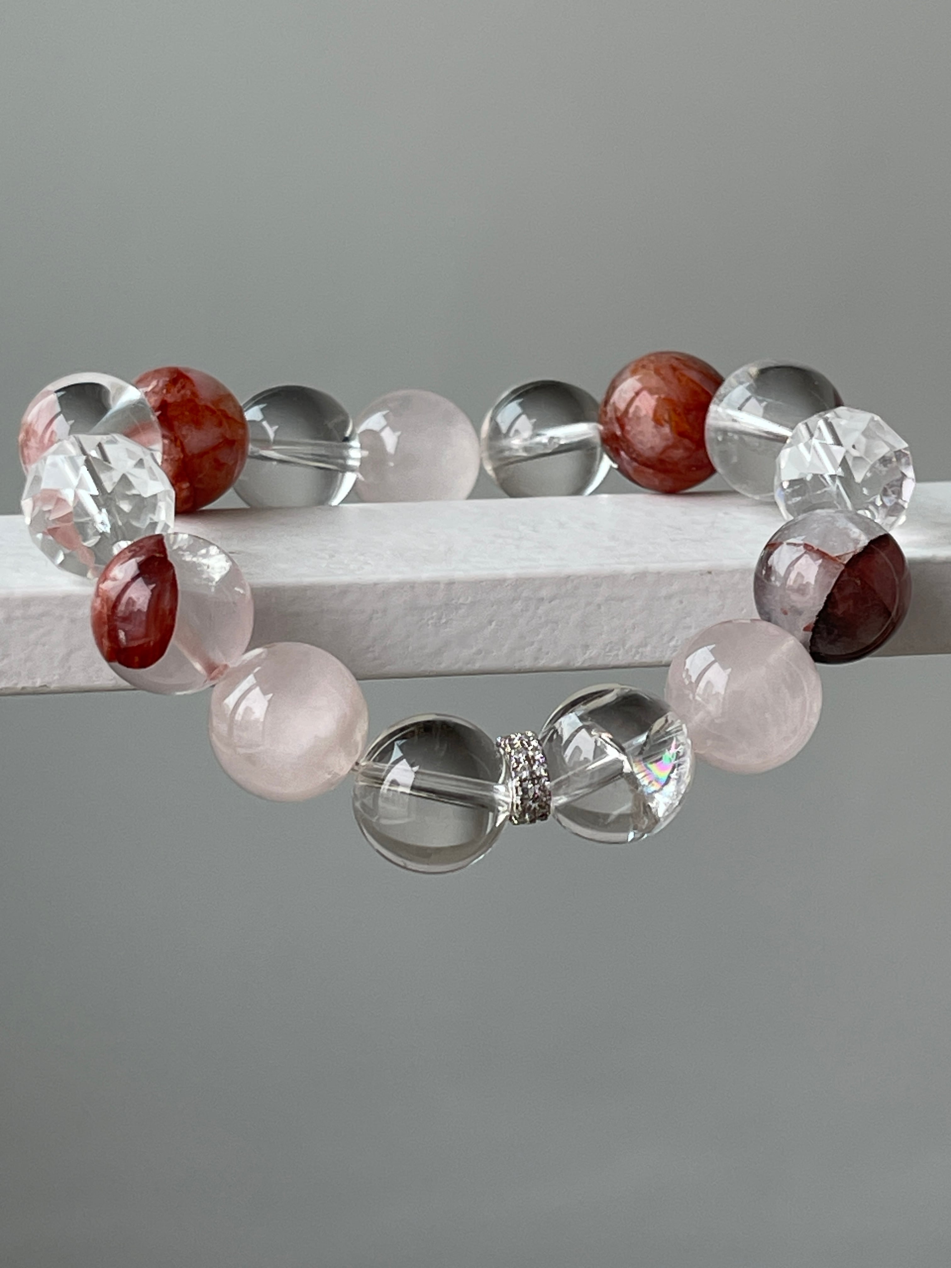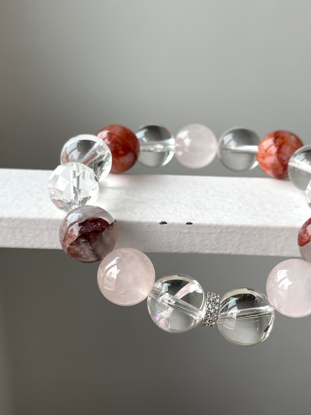 透明度の高い天然水晶とレッドヘマタイト、ローズクォーツを組み合わせたパワーストーンブレスレットが入荷致しました。