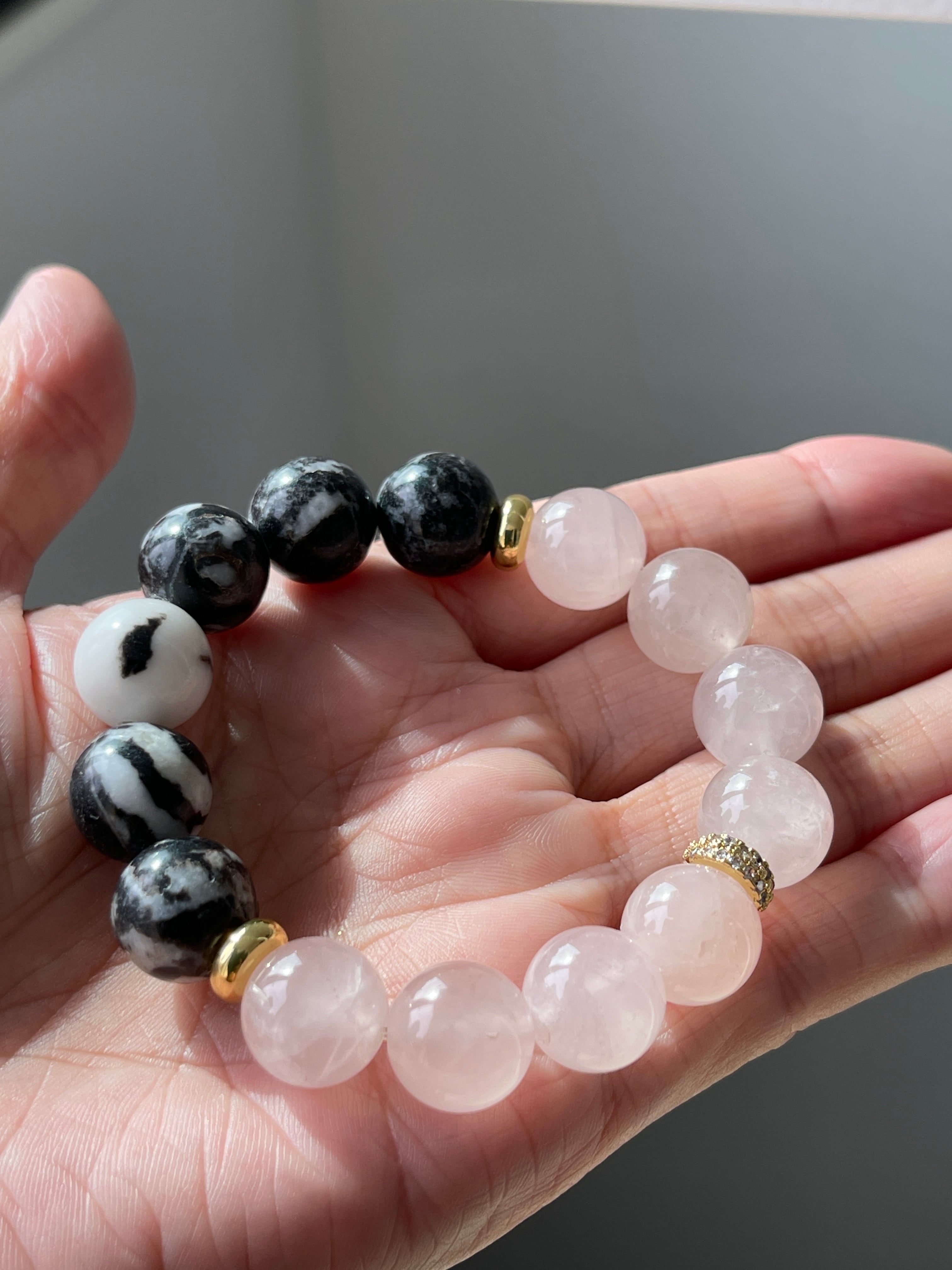 ローズクォーツとゼブラジャスパーのパワーストーンブレスレットです。ポイントにゴールドカラーの2種類のパーツをバランス良く配置しました。