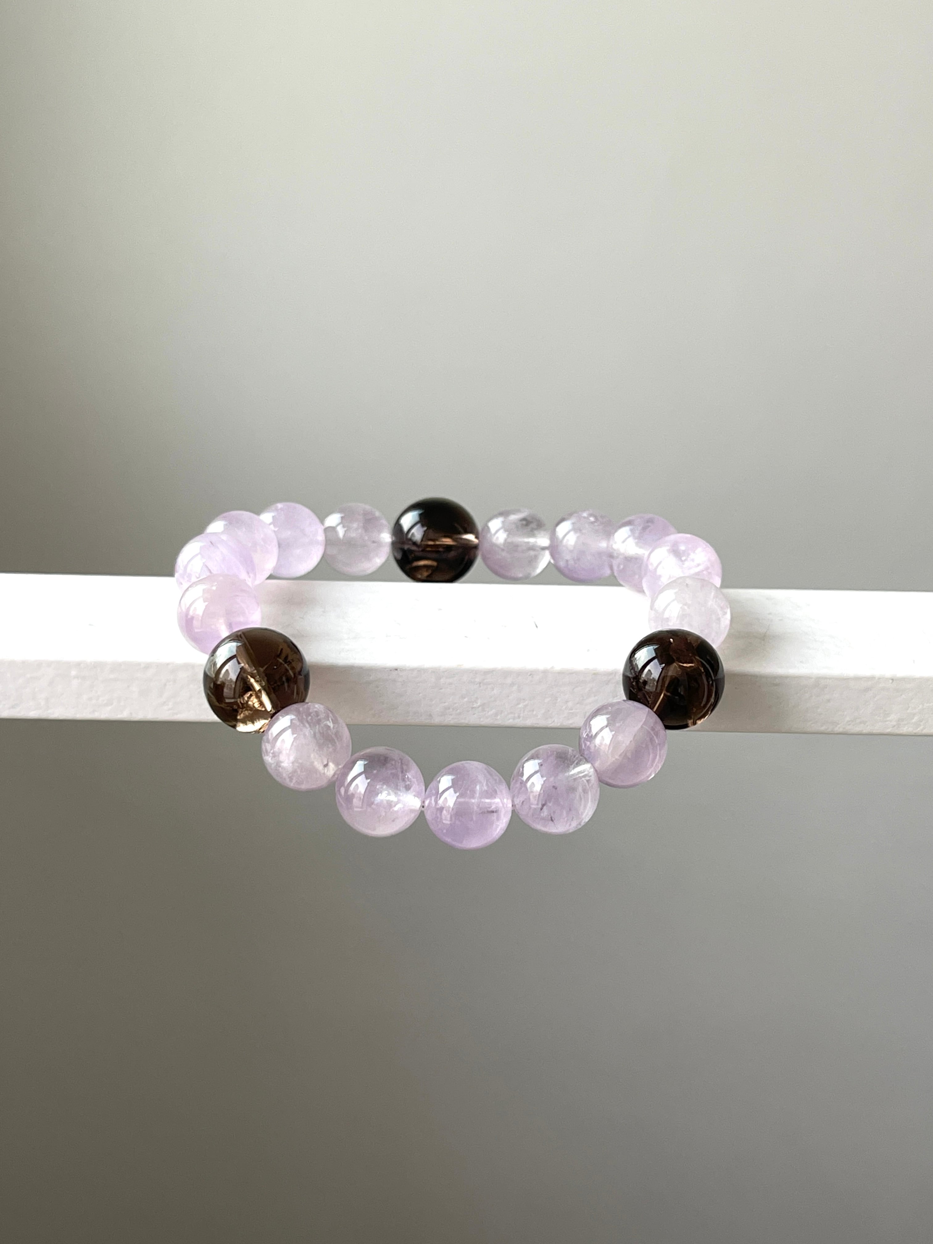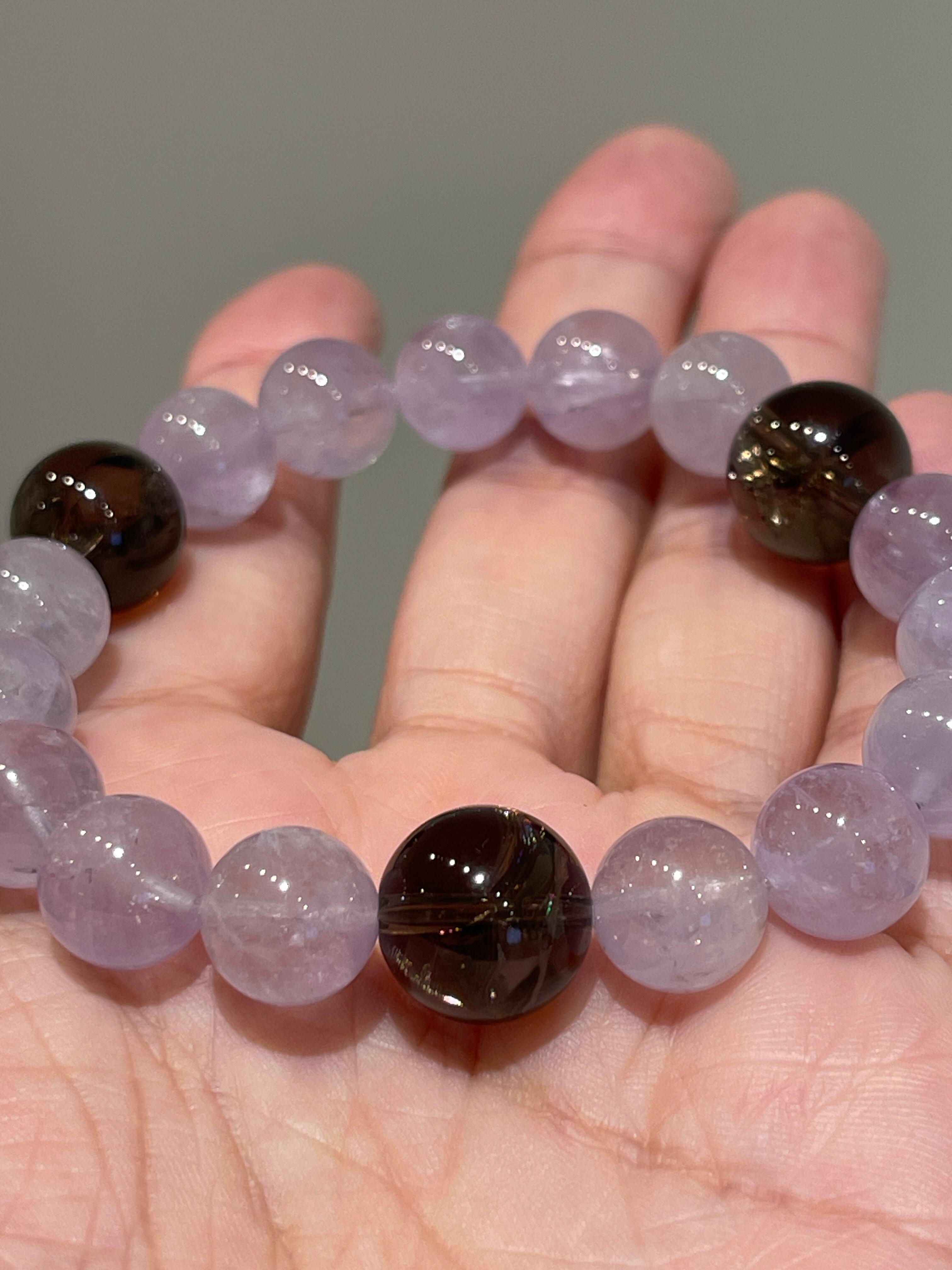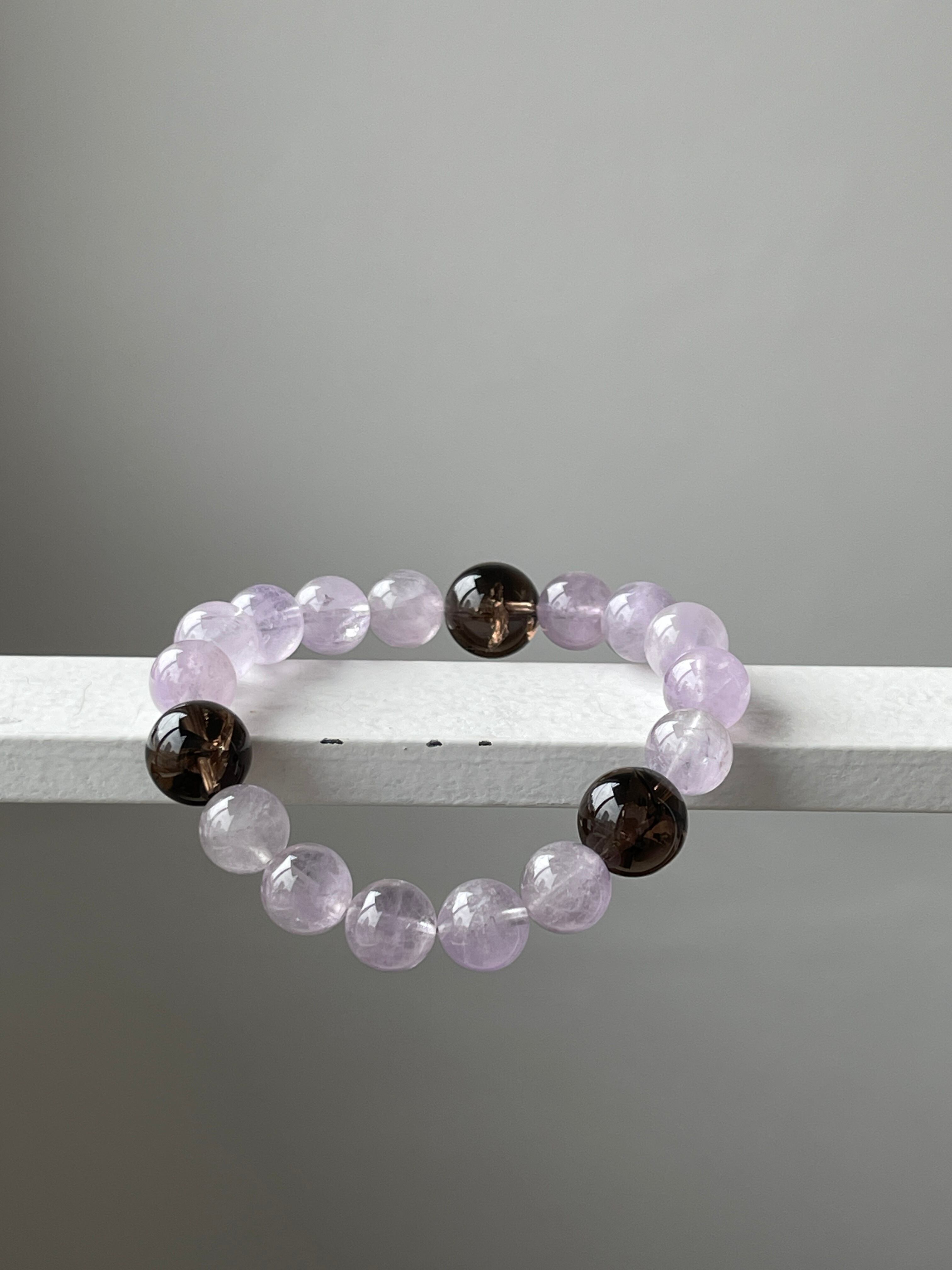 落ち着いたカラーのアイリススモーキークォーツ3石をアクセントにしたラベンダーアメジストのパワーストーンブレスレットです。