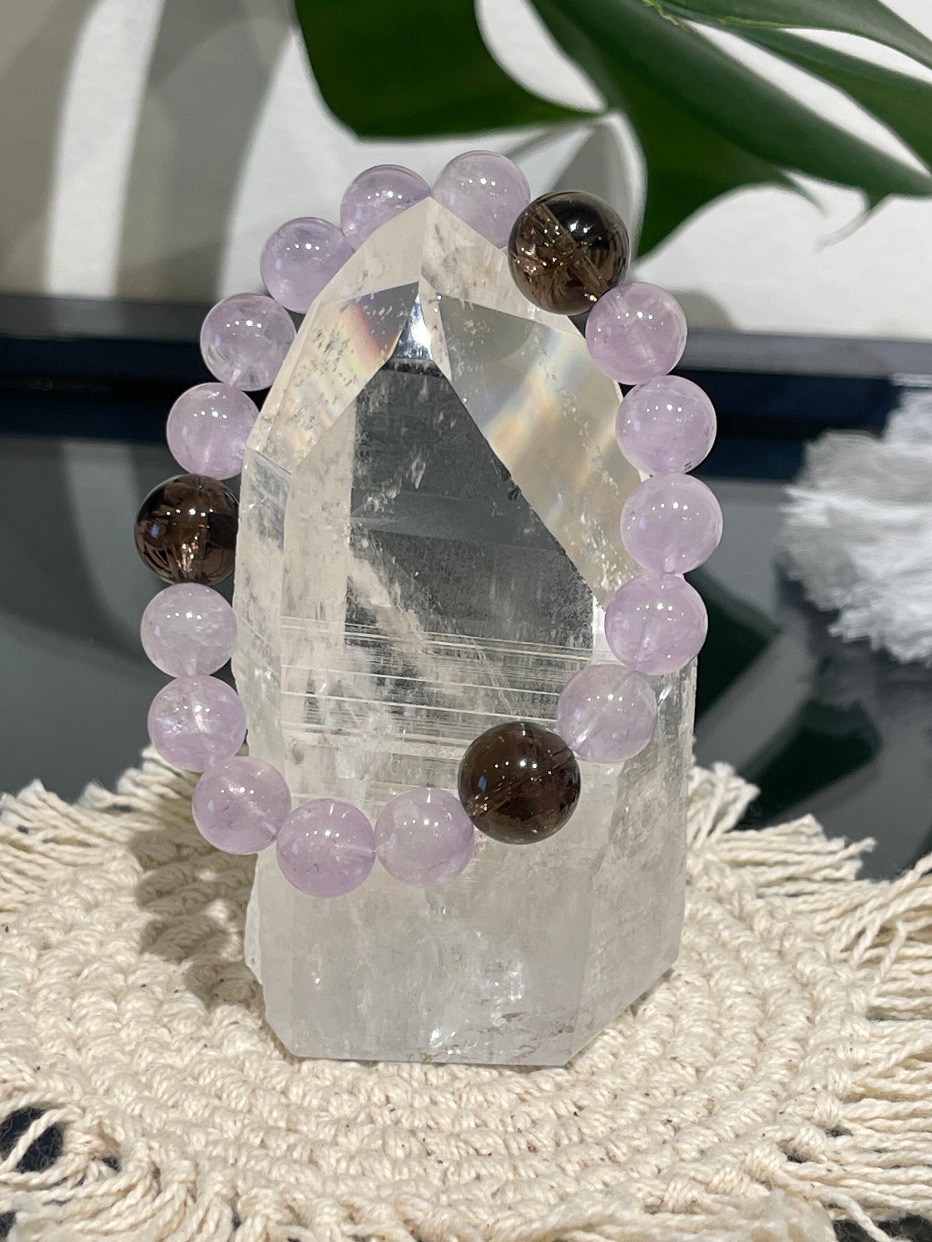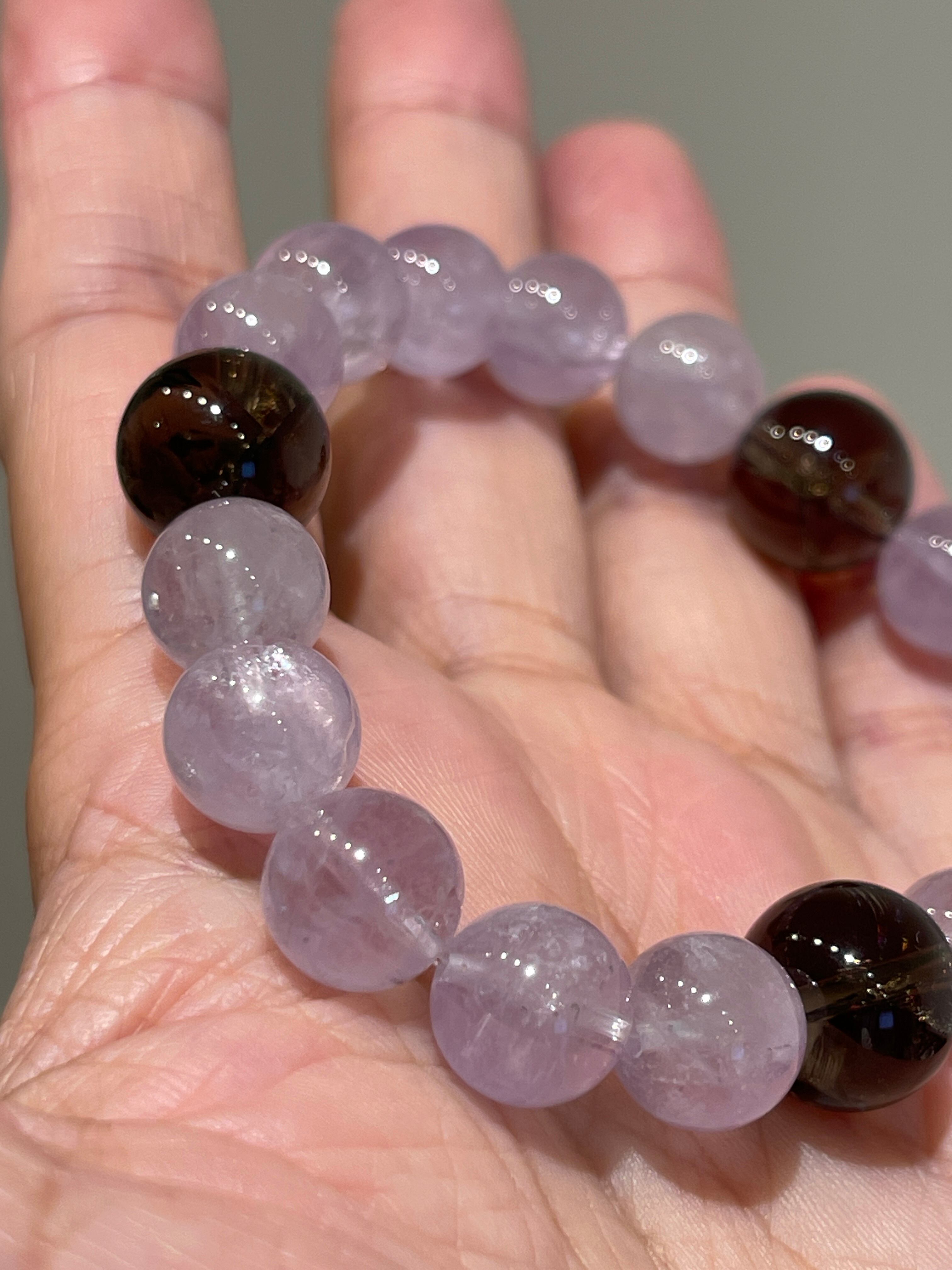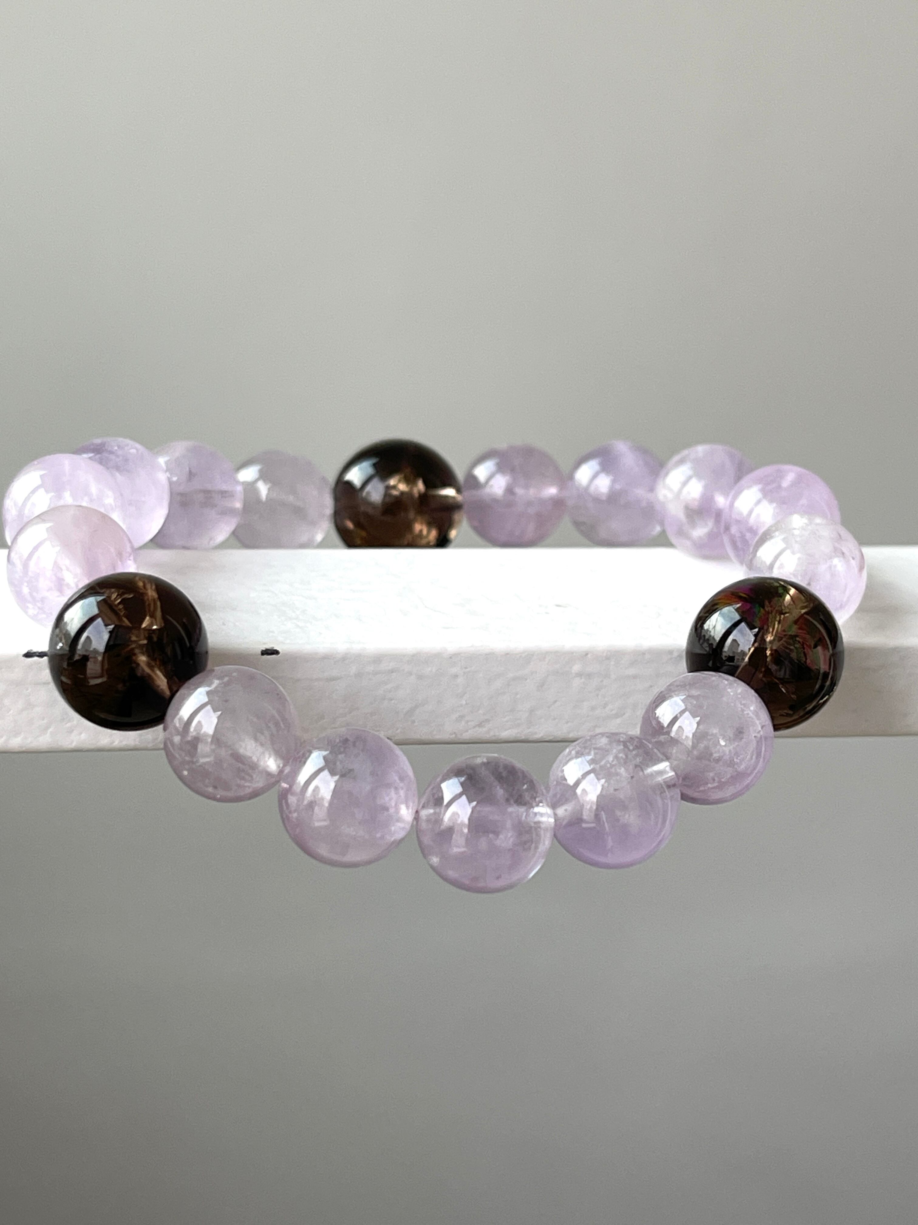 落ち着いたカラーのアイリススモーキークォーツ3石をアクセントにしたラベンダーアメジストのパワーストーンブレスレットです。