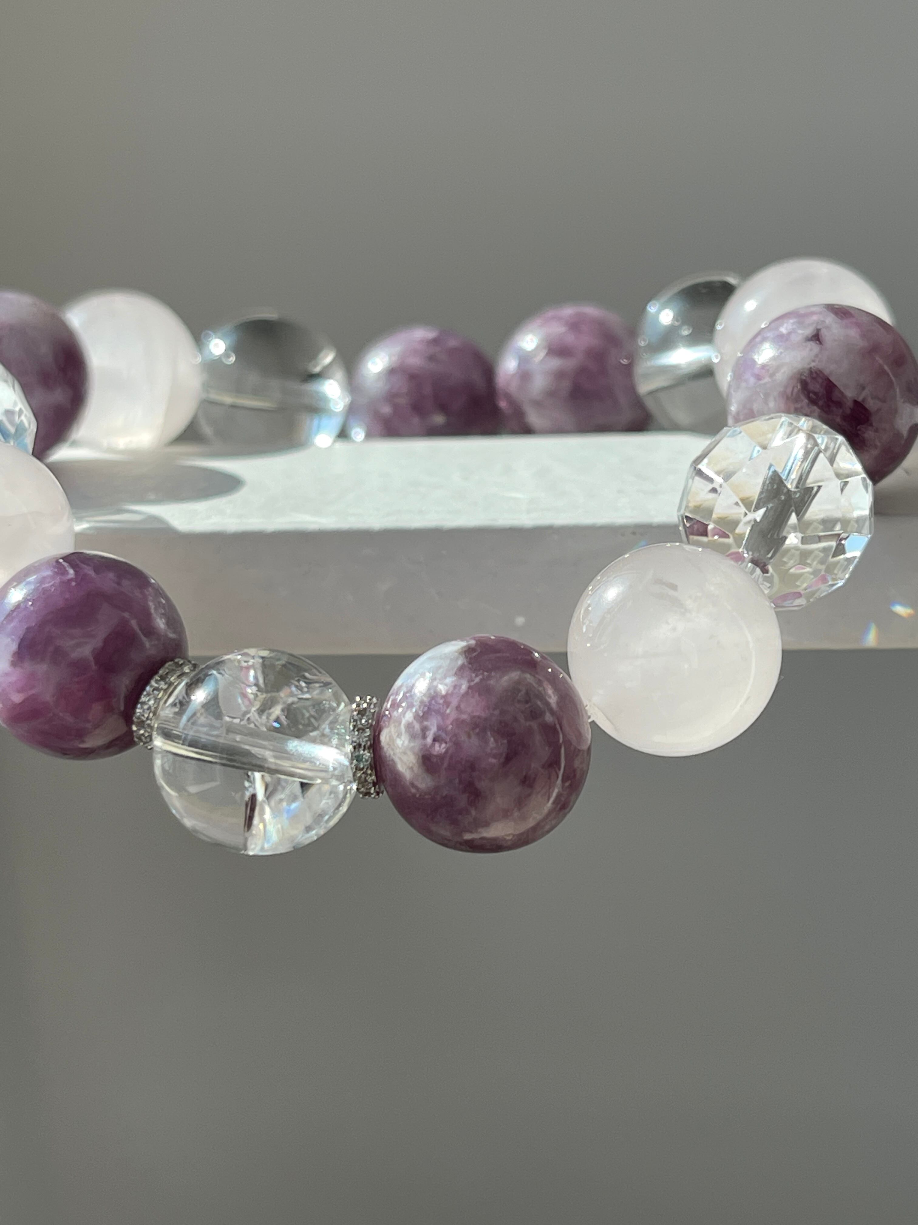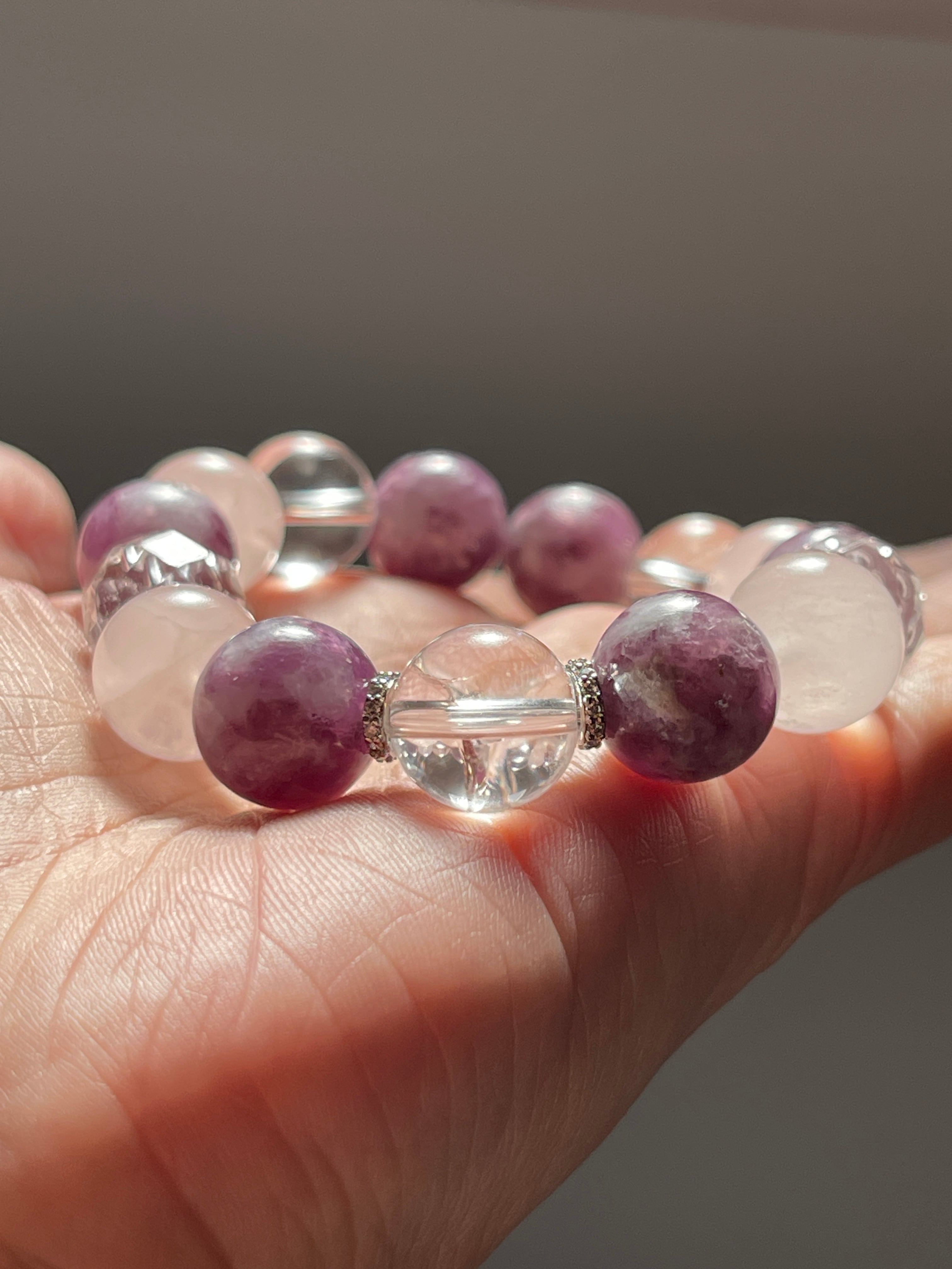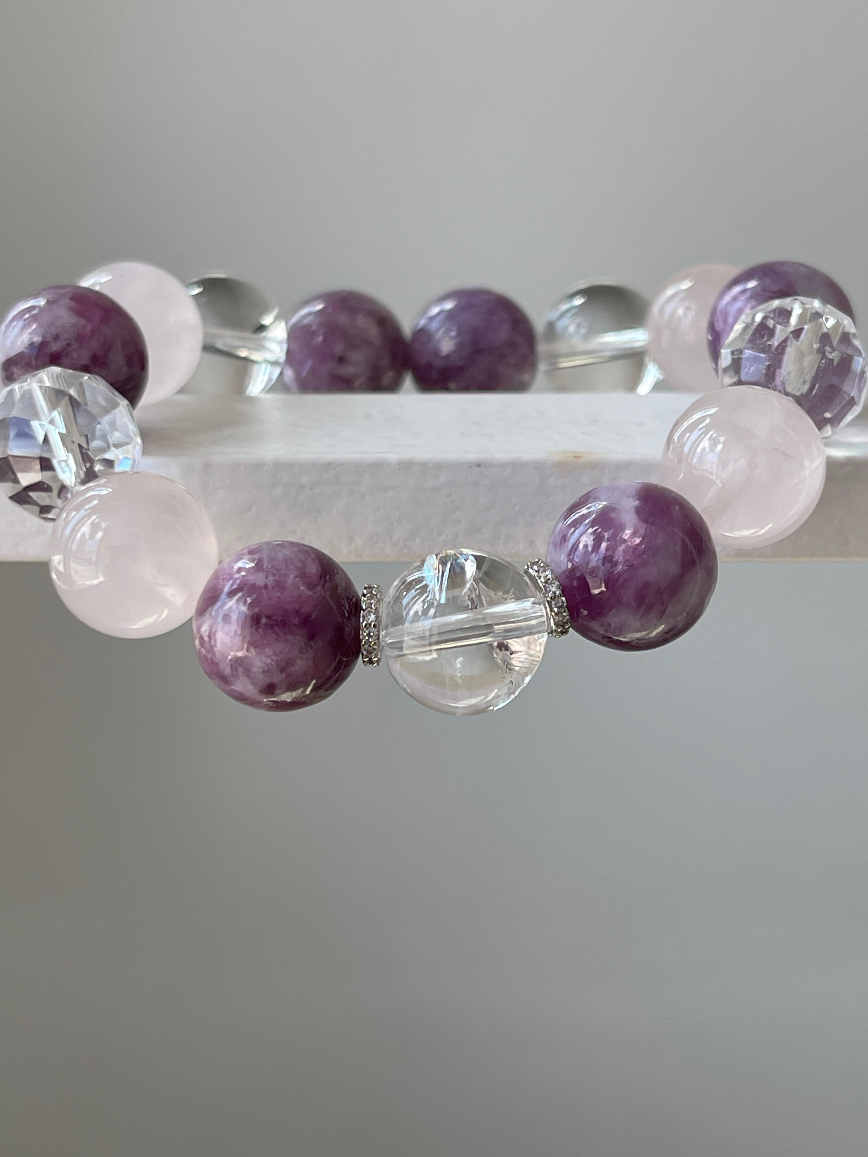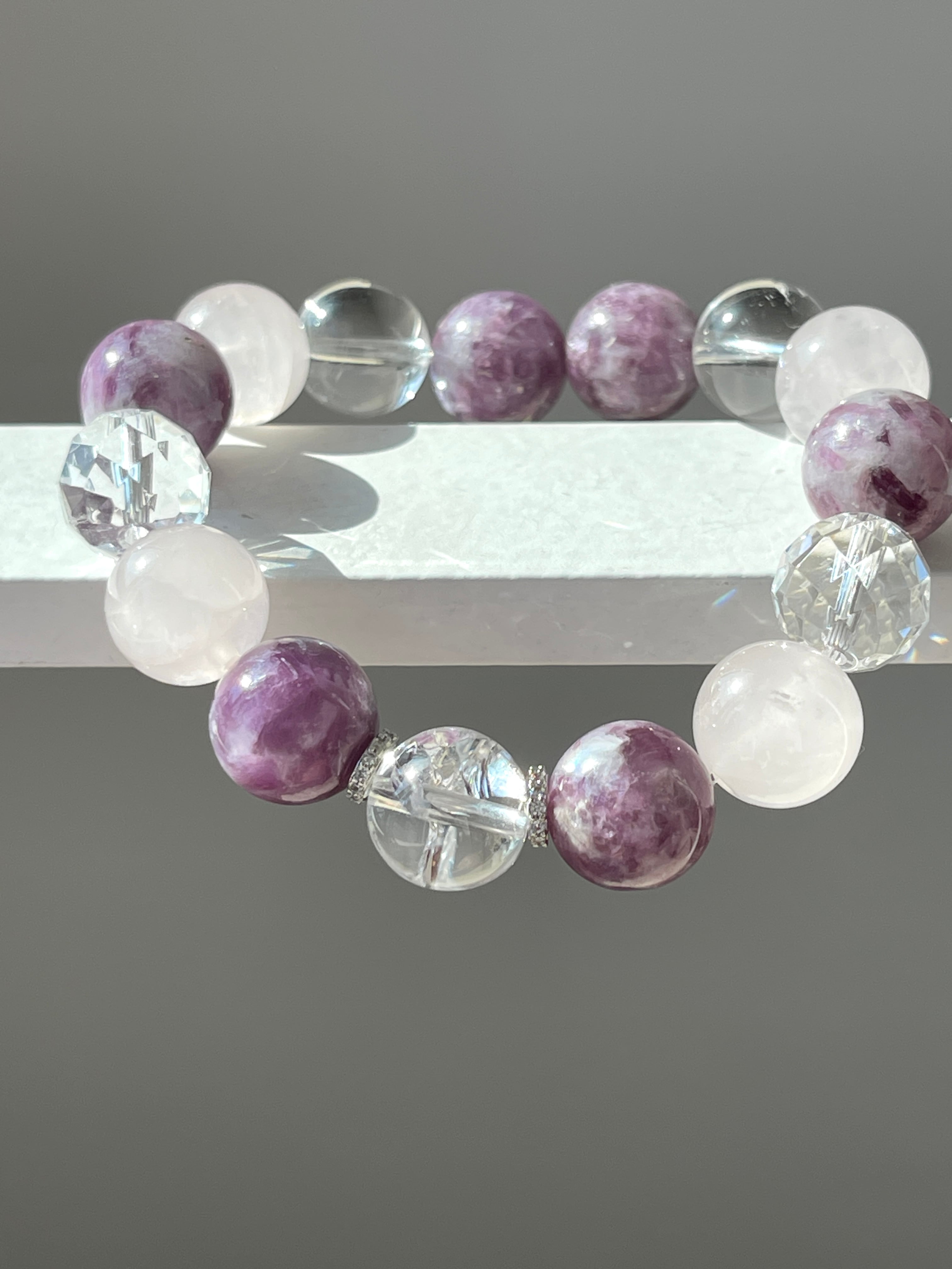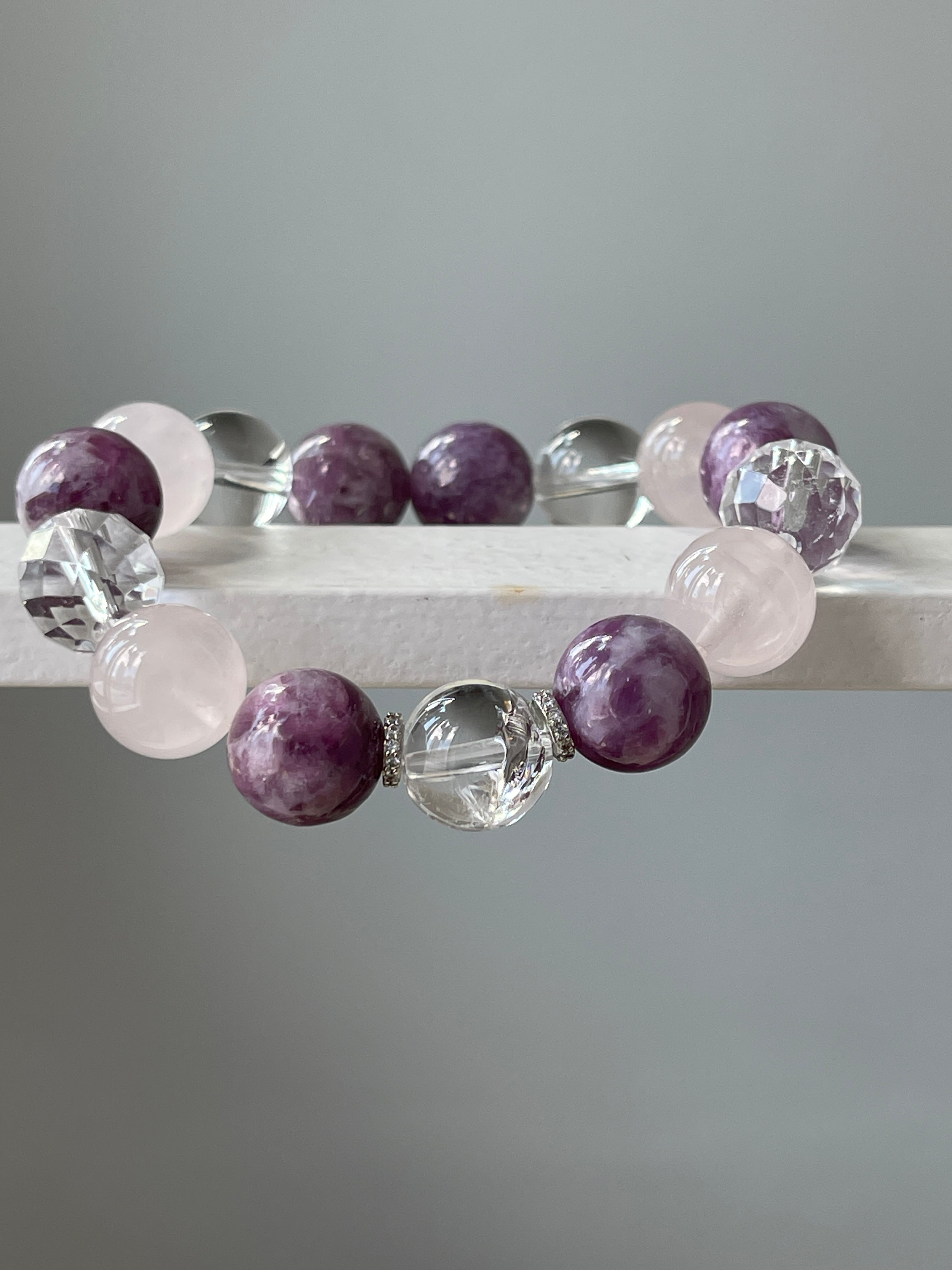 レピドライトとシリカ(石英)成分が共生したブラジル産レピドライトと、フワッと優しいピンクのローズクォーツ、アイリスクォーツ、天然水晶(カットあり、なし)を組み合わせたパワーストーンブレスレットです。