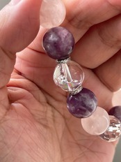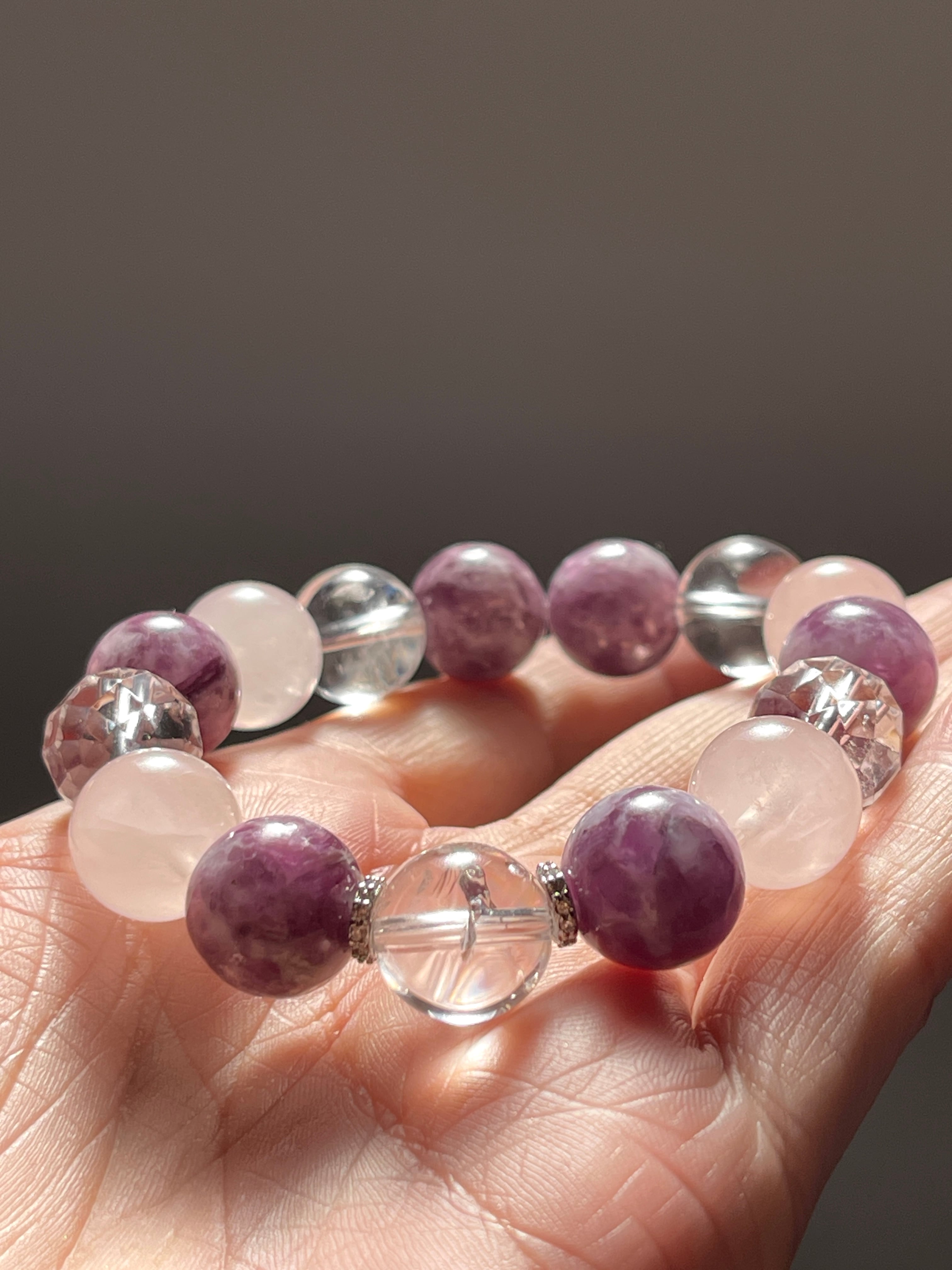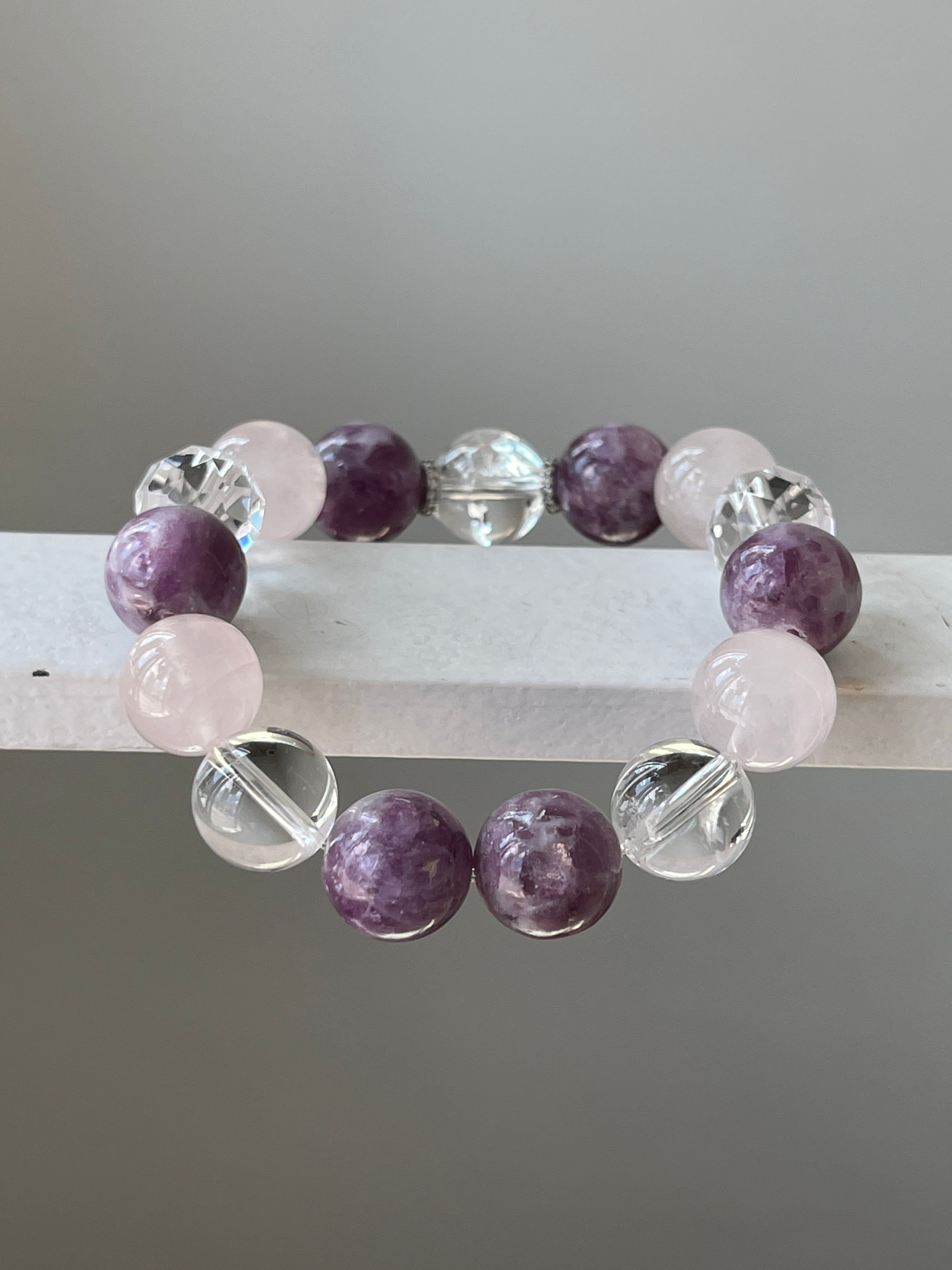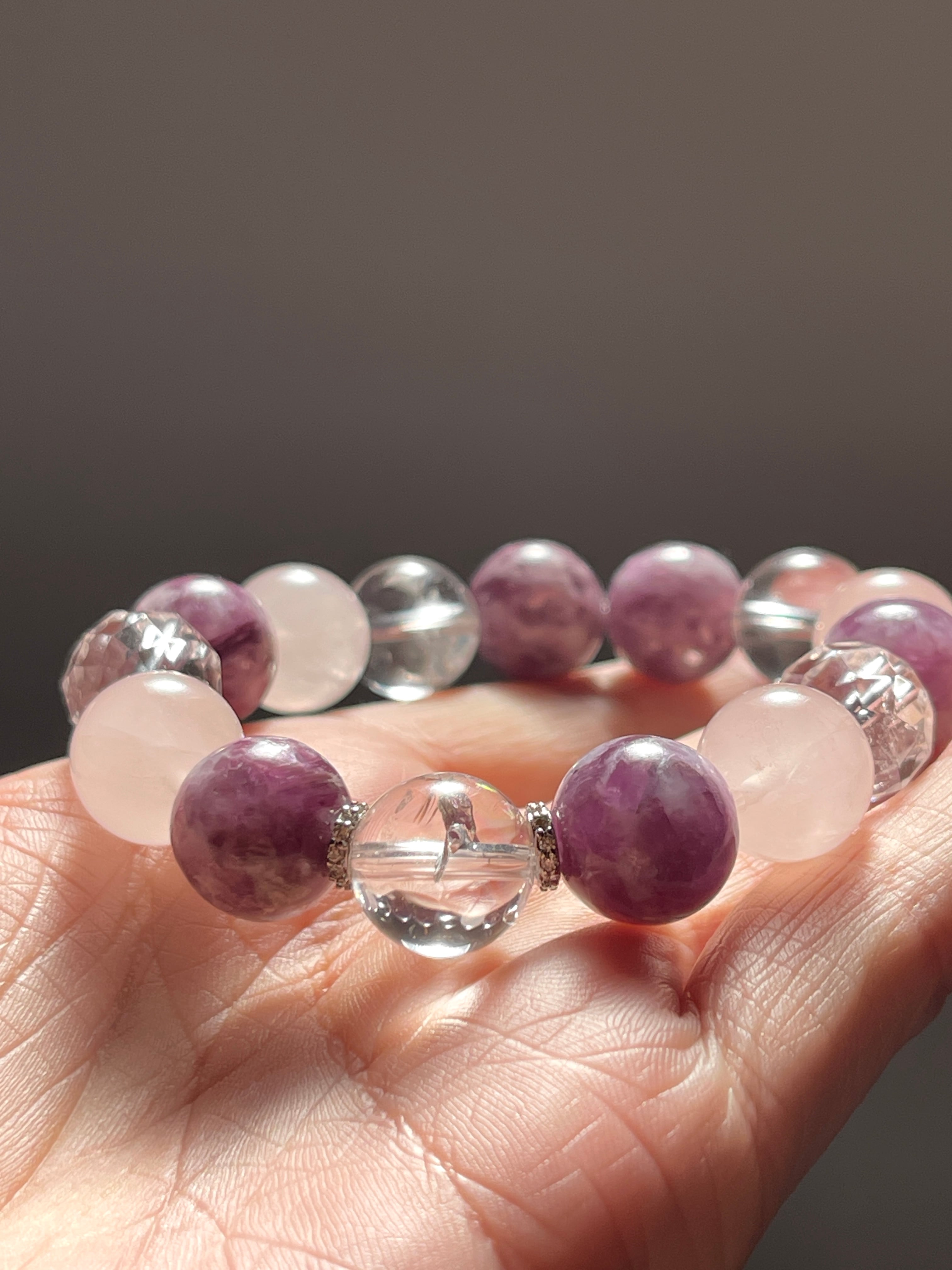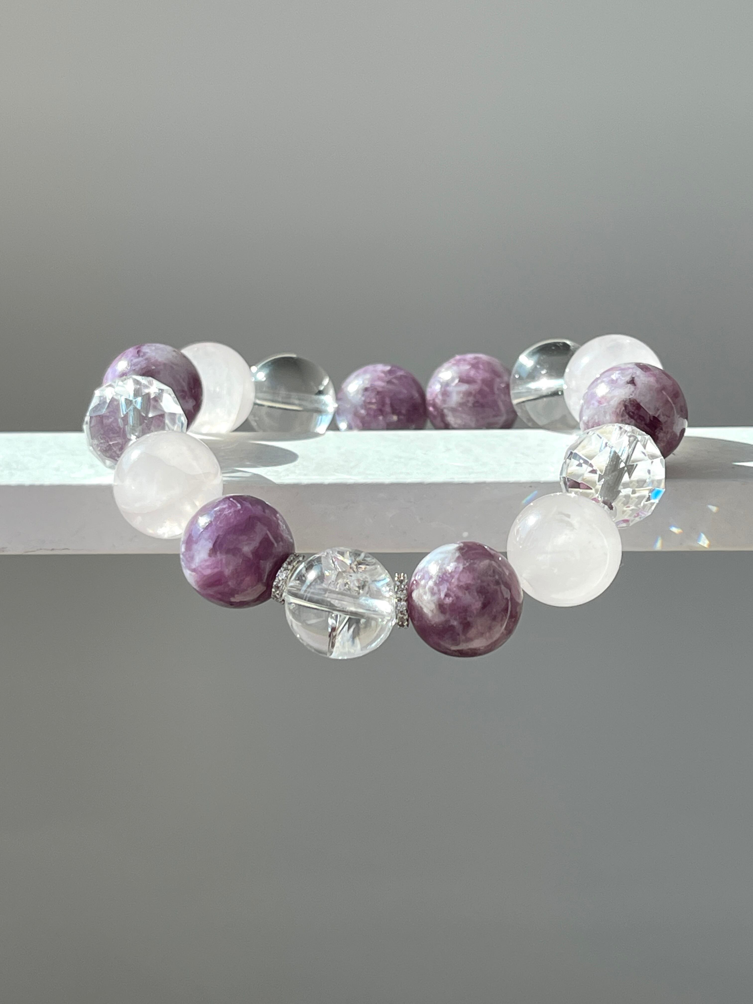レピドライトとシリカ(石英)成分が共生したブラジル産レピドライトと、フワッと優しいピンクのローズクォーツ、アイリスクォーツ、天然水晶(カットあり、なし)を組み合わせたパワーストーンブレスレットです。