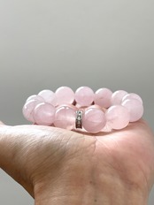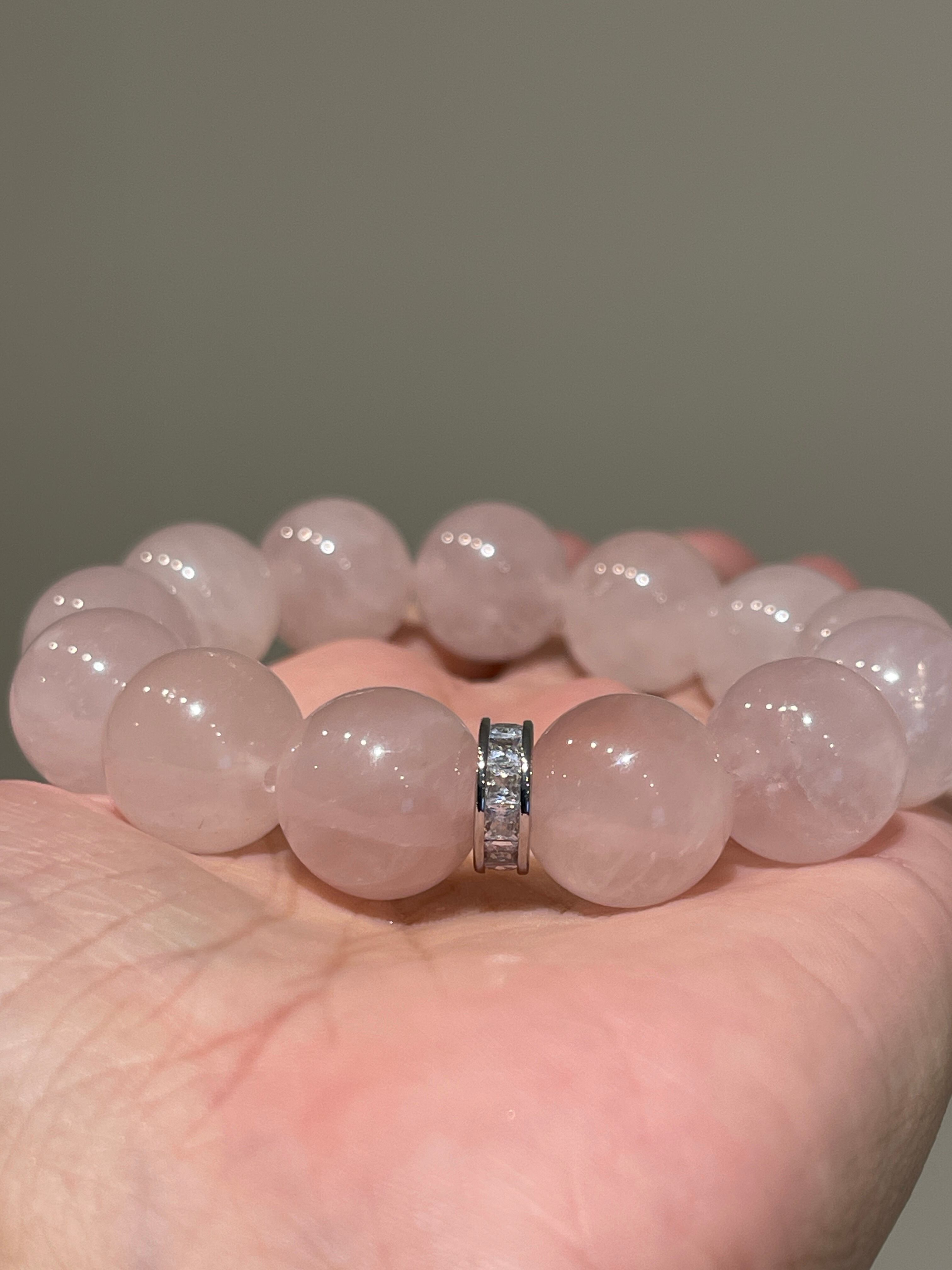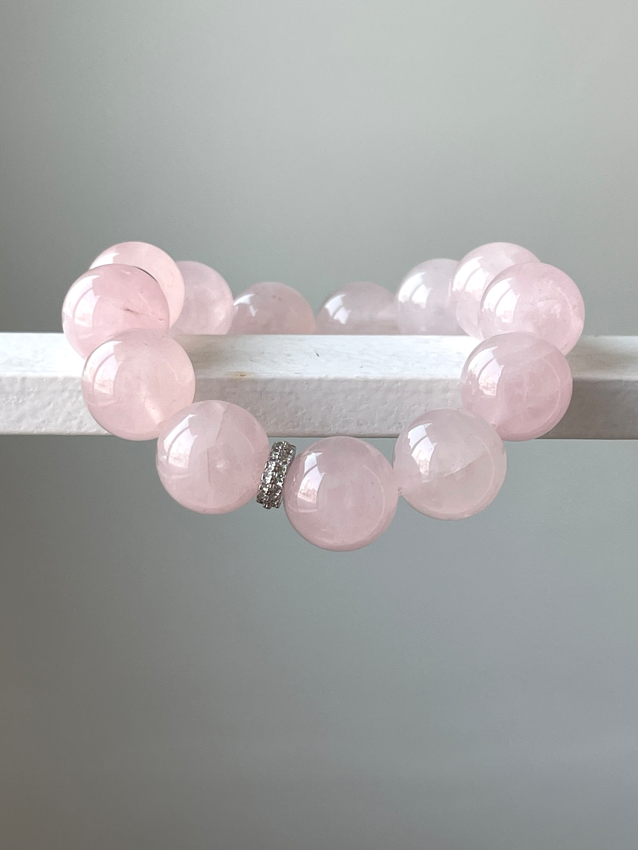 ブレスレットのデザインは、大珠14ミリのローズクォーツに2種類のジルコニアがセッティングされた