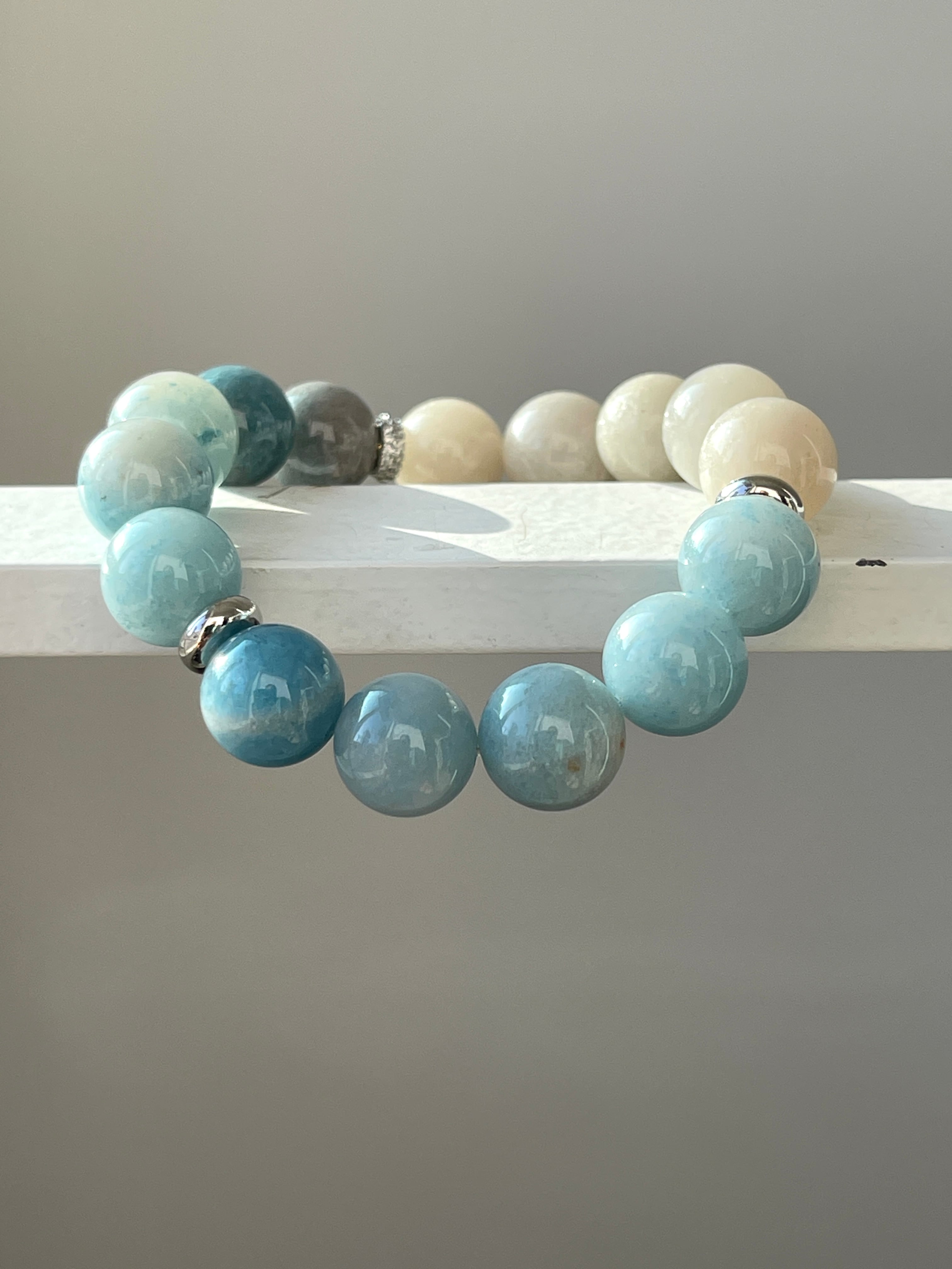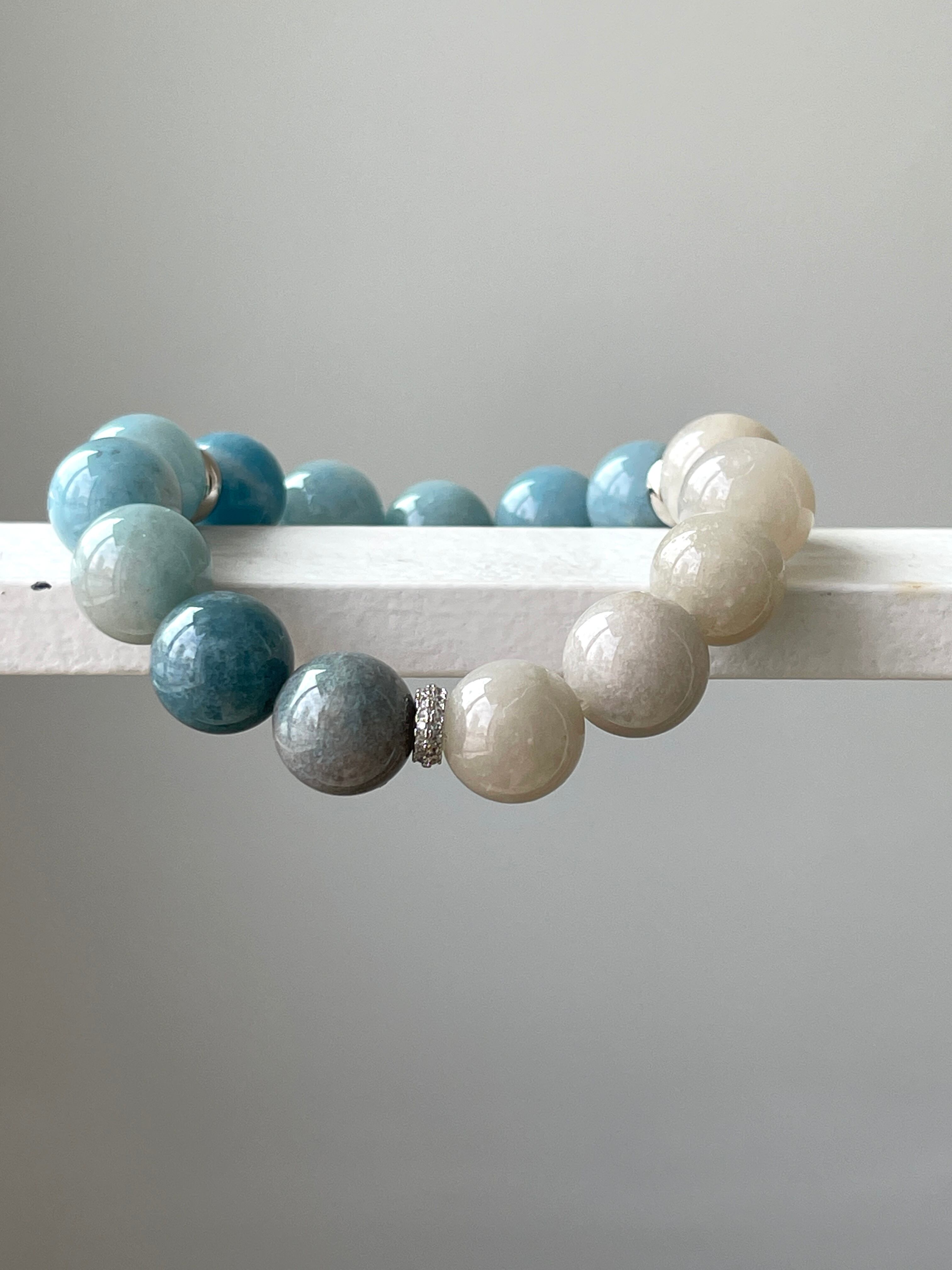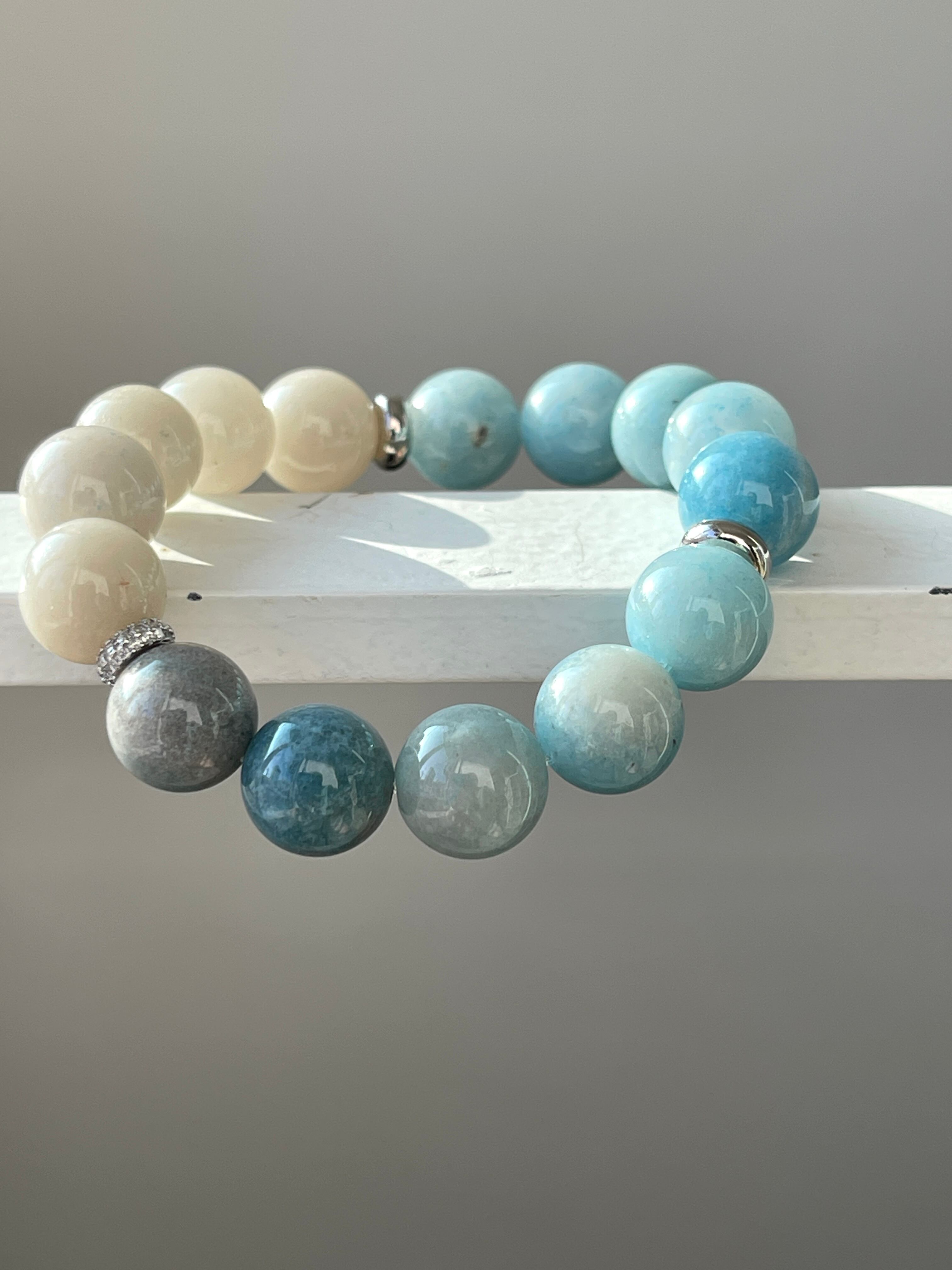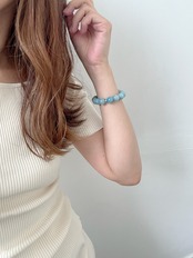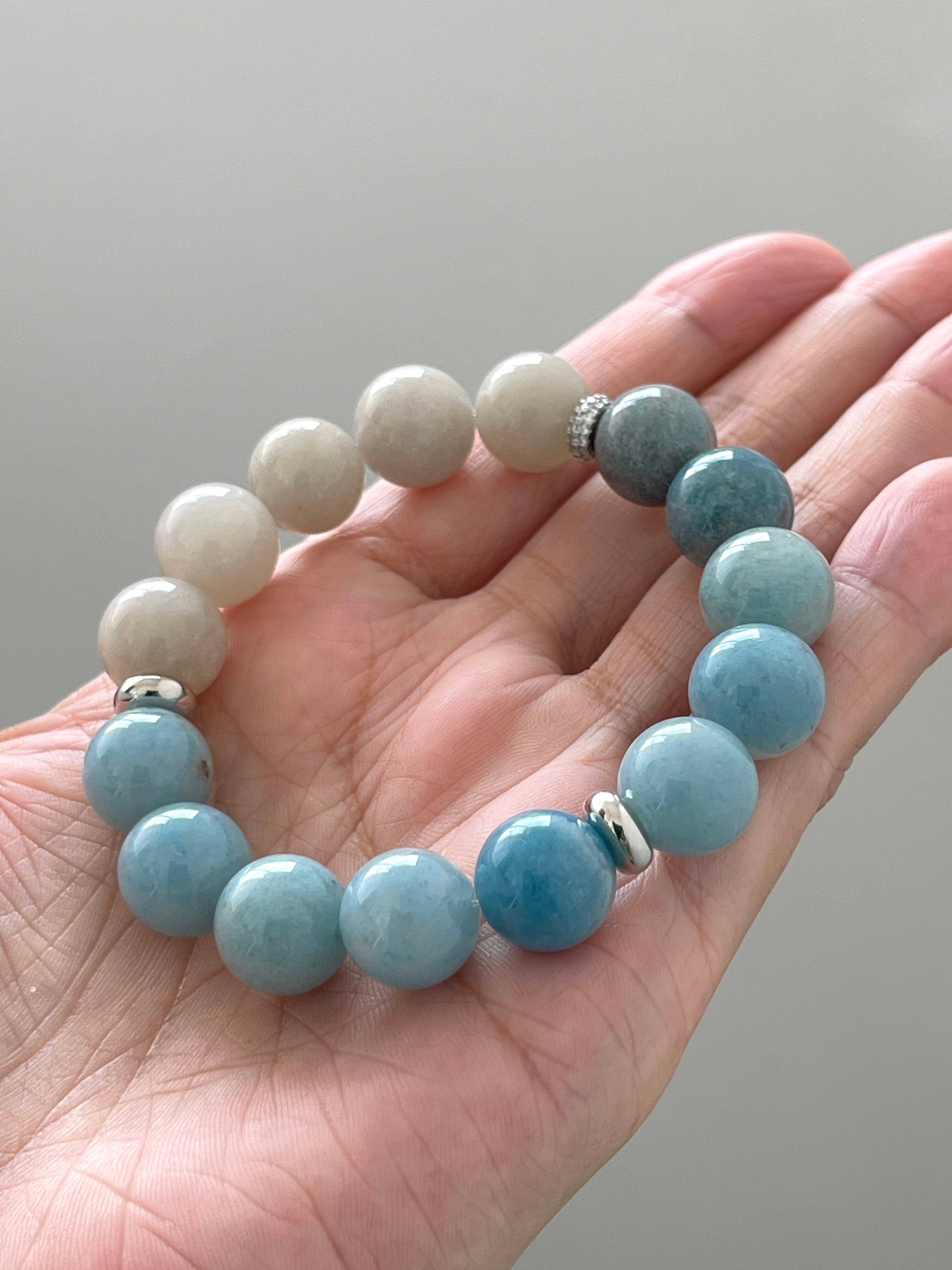 鮮やかな水色と、半透明のグレー、白色のコントラストが特徴です。水色とグレーが混ざり合った模様や、水色の斑点状の内包物など、一粒一粒個性的な魅力を持っています。