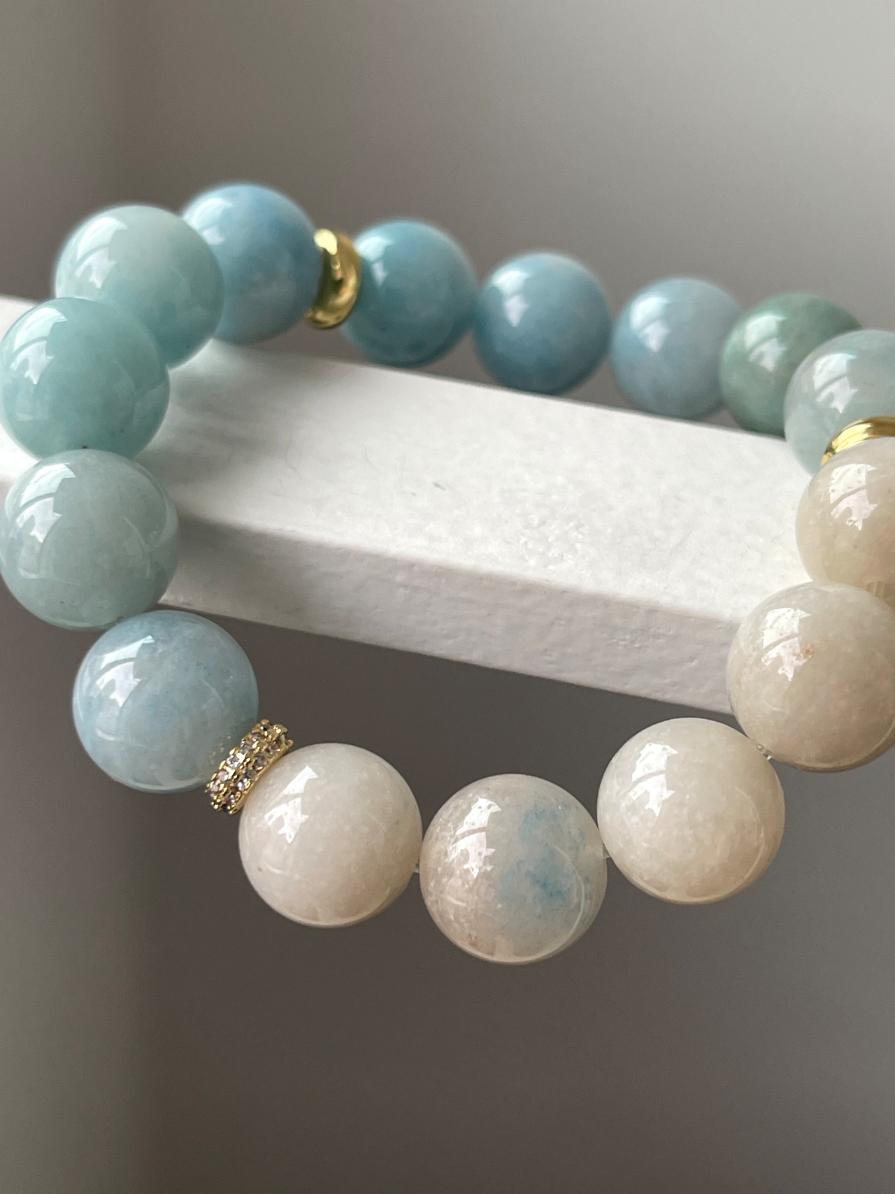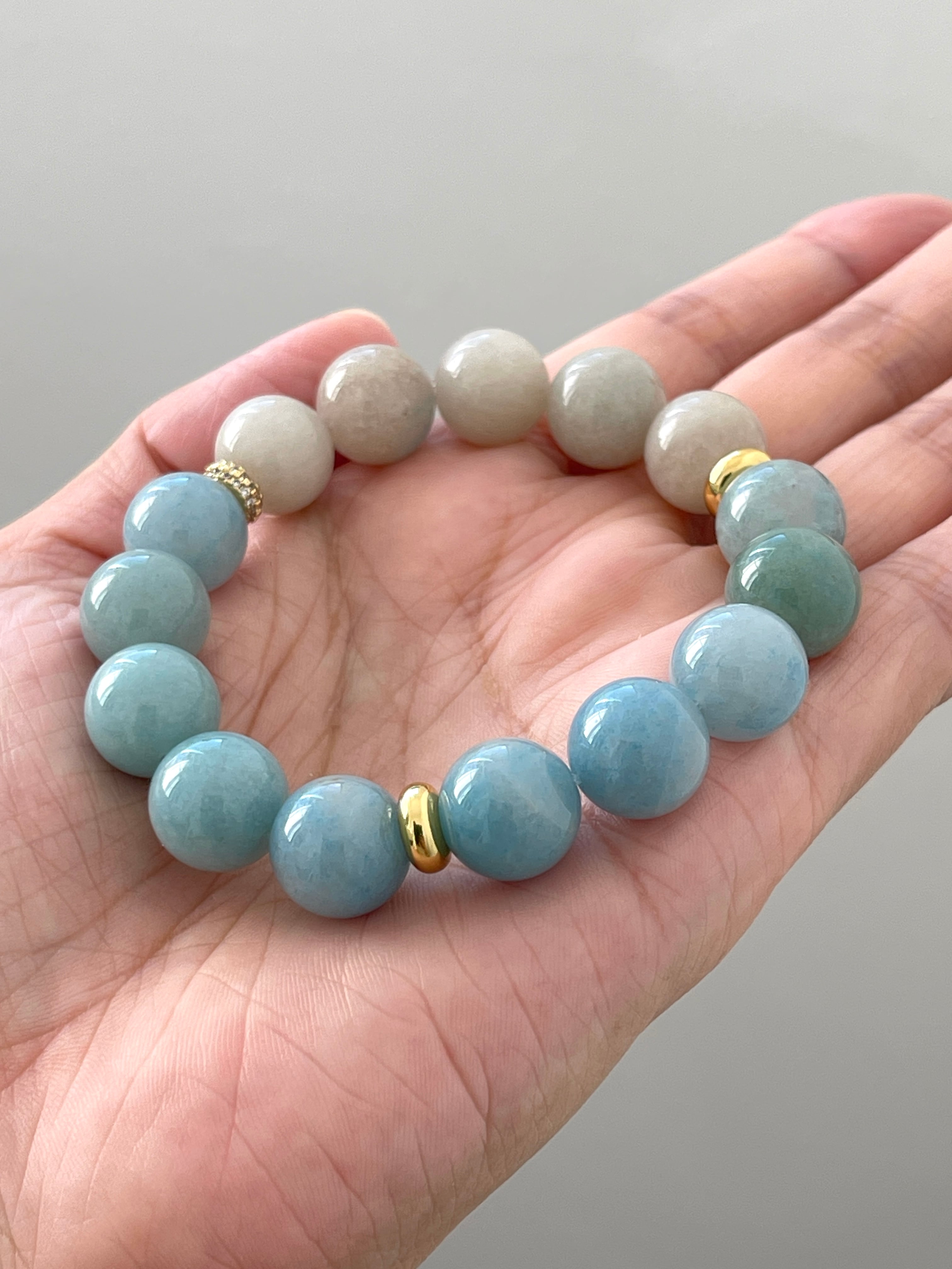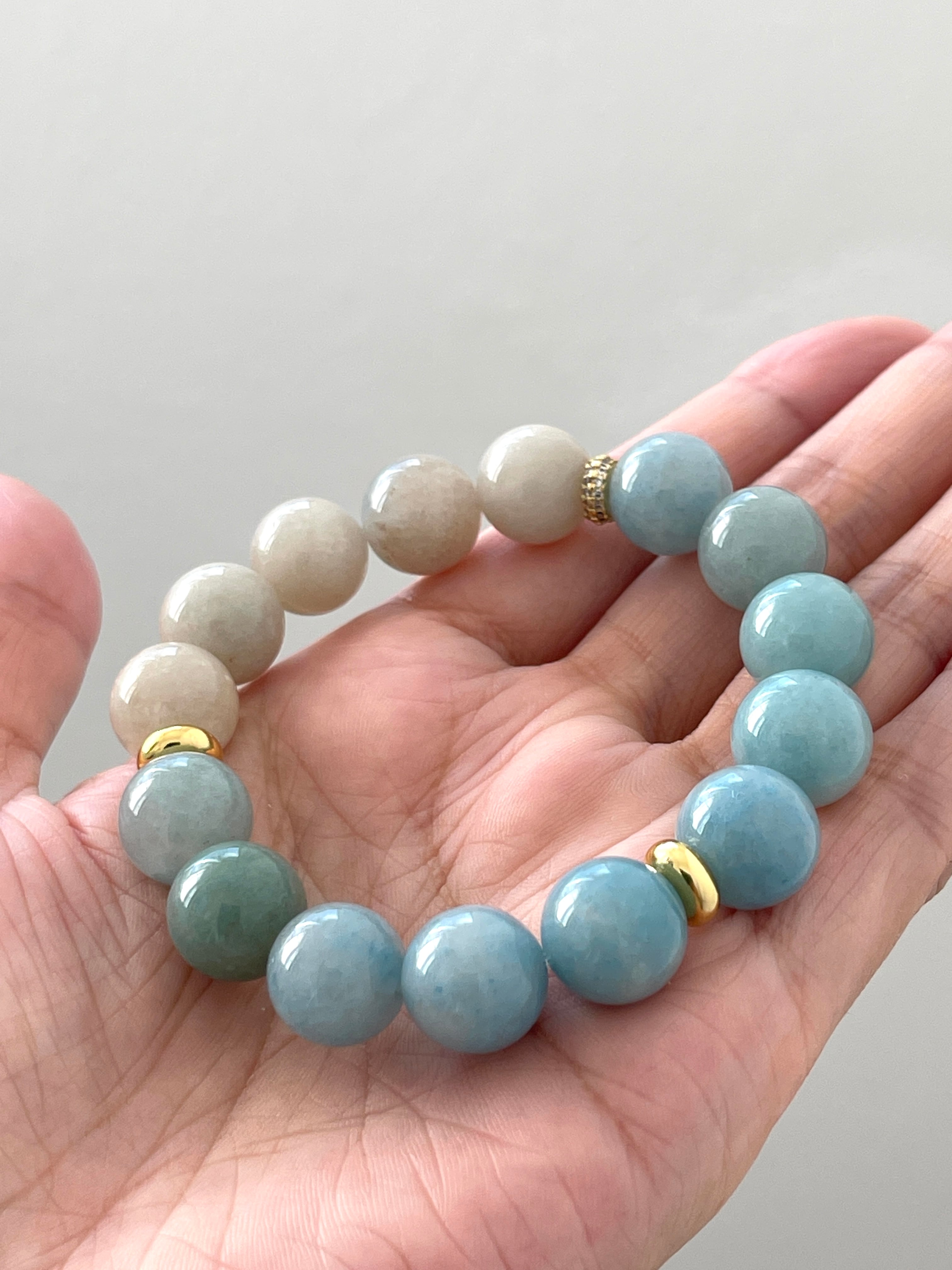 鮮やかな水色と、半透明のグレー、白色のコントラストが特徴です。水色とグレーが混ざり合った模様や、水色の斑点状の内包物など、一粒一粒個性的な魅力を持っています。
