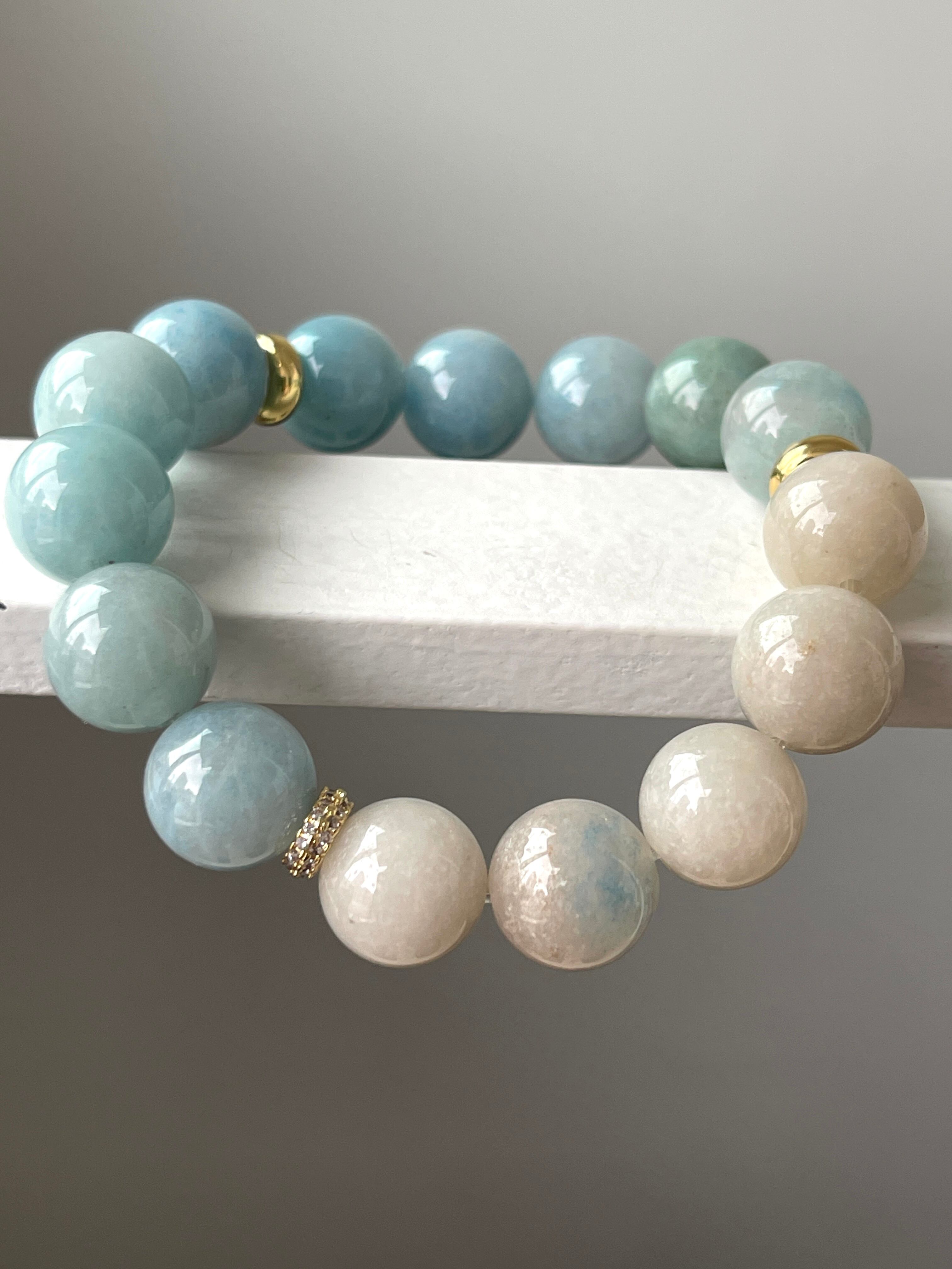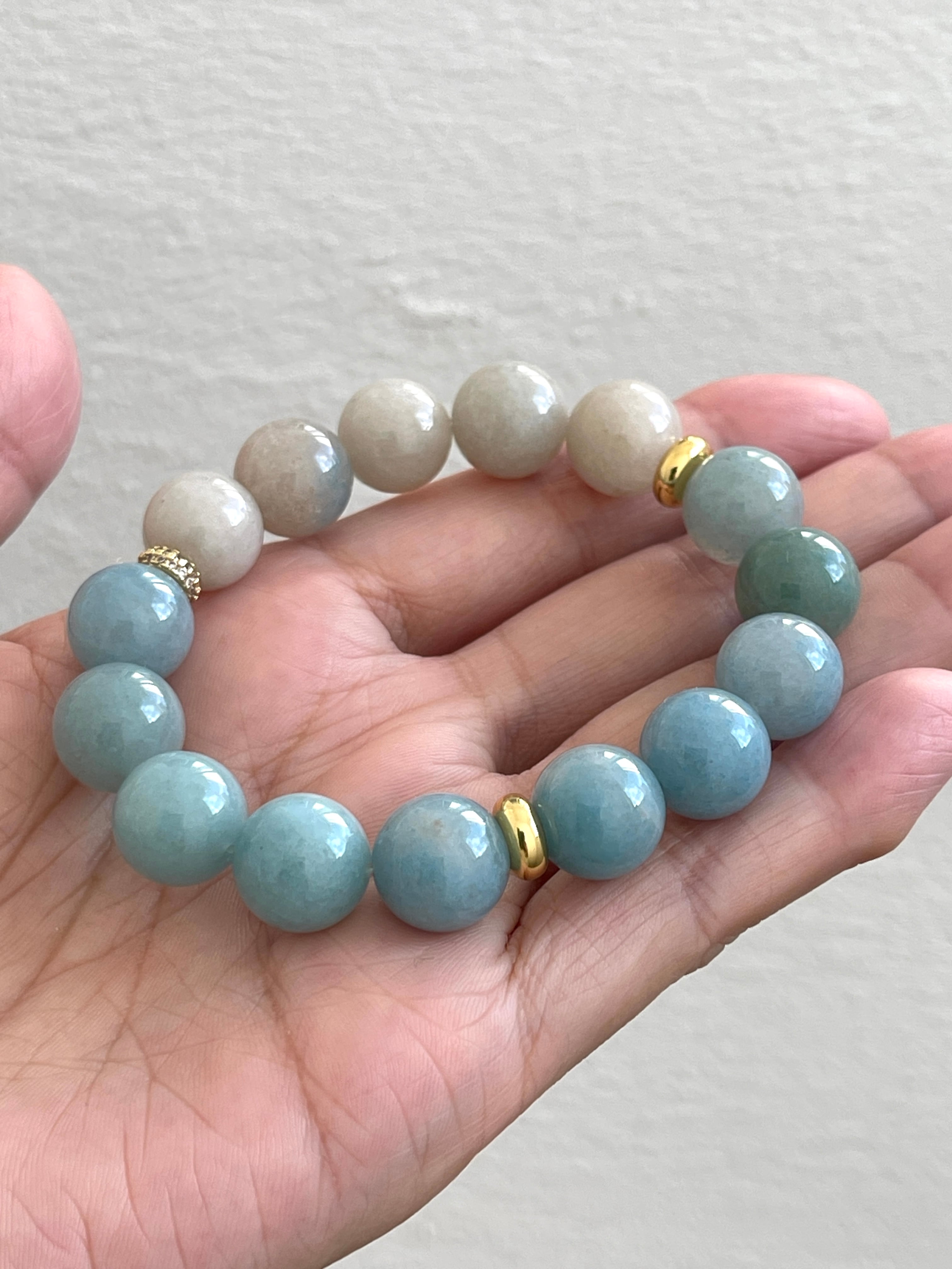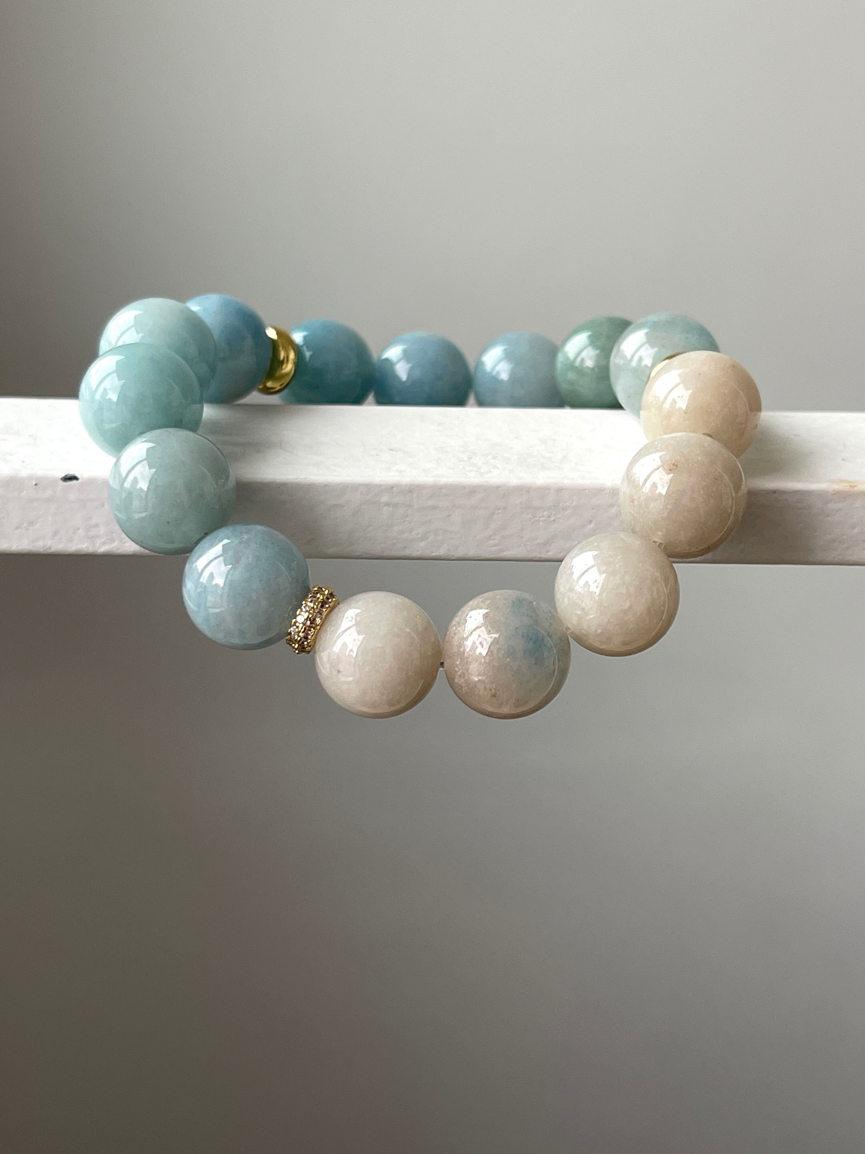 鮮やかな水色と、半透明のグレー、白色のコントラストが特徴です。水色とグレーが混ざり合った模様や、水色の斑点状の内包物など、一粒一粒個性的な魅力を持っています。