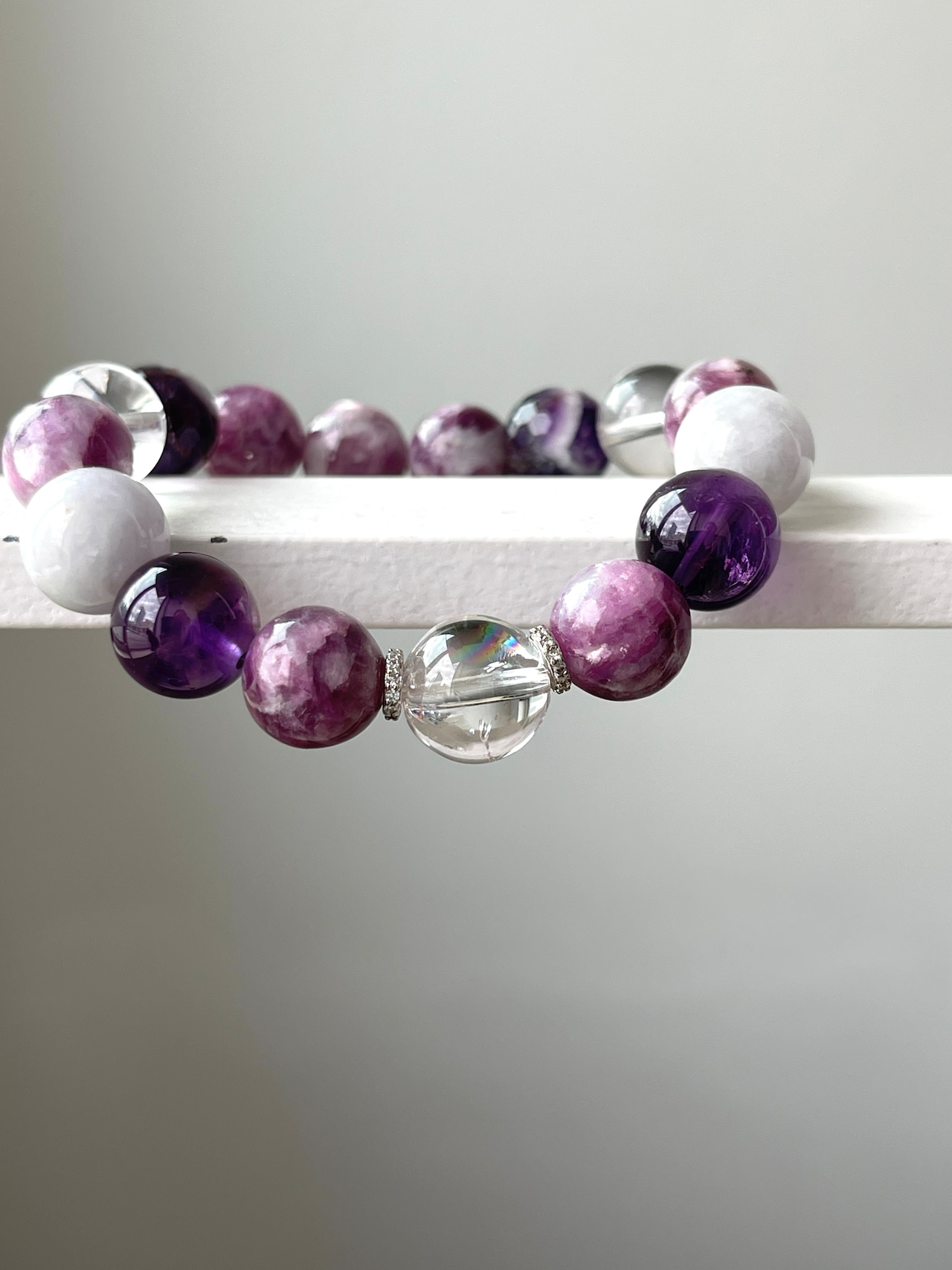 天然水晶、アイリスクォーツ、ビルマ産翡翠を加えバランスよくデザインいたしました。