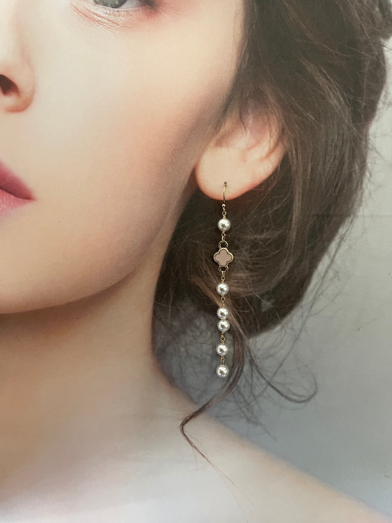 薄ピンクのクローバーが可愛いクリスタルパールのロングピアスです。