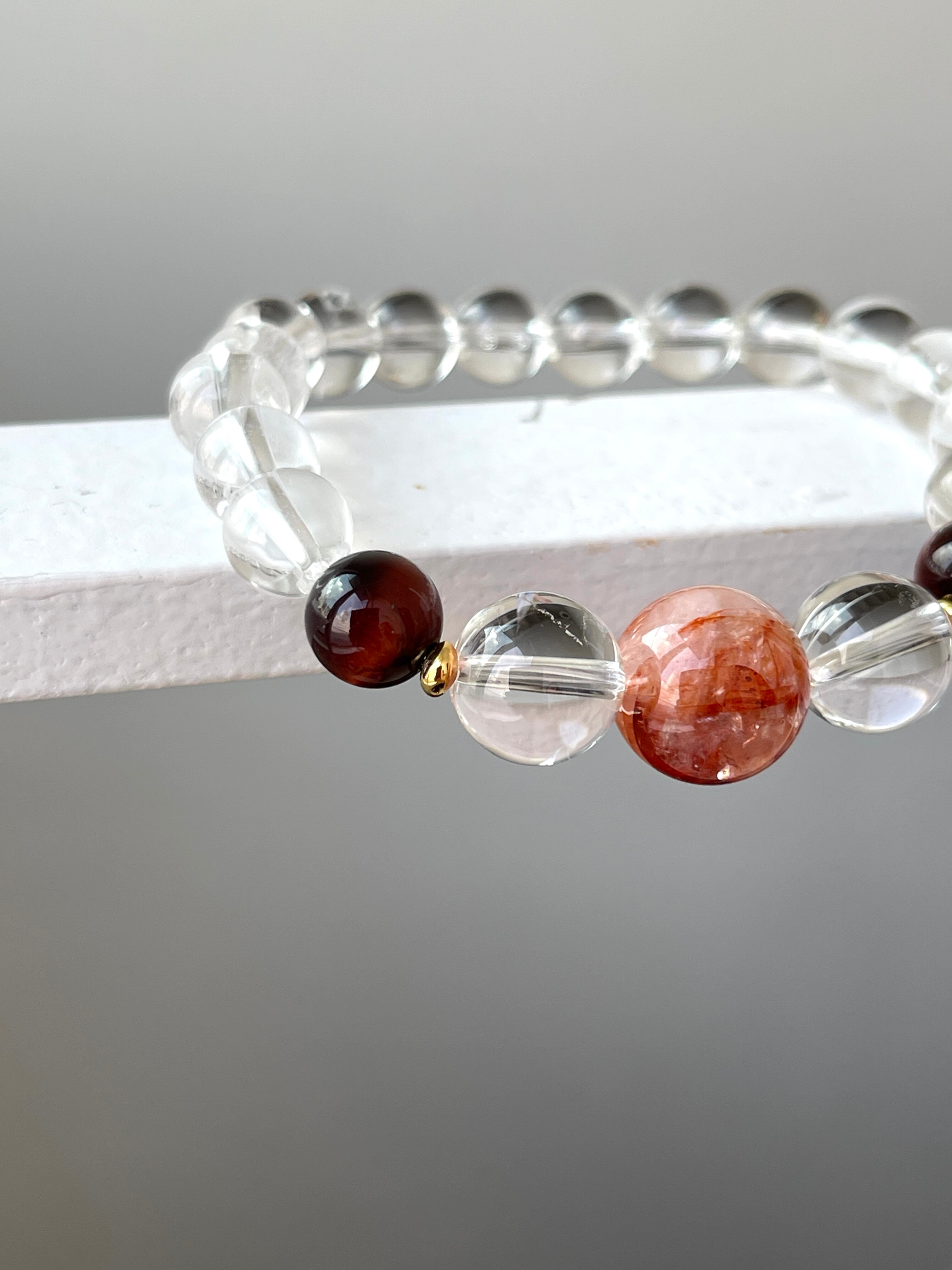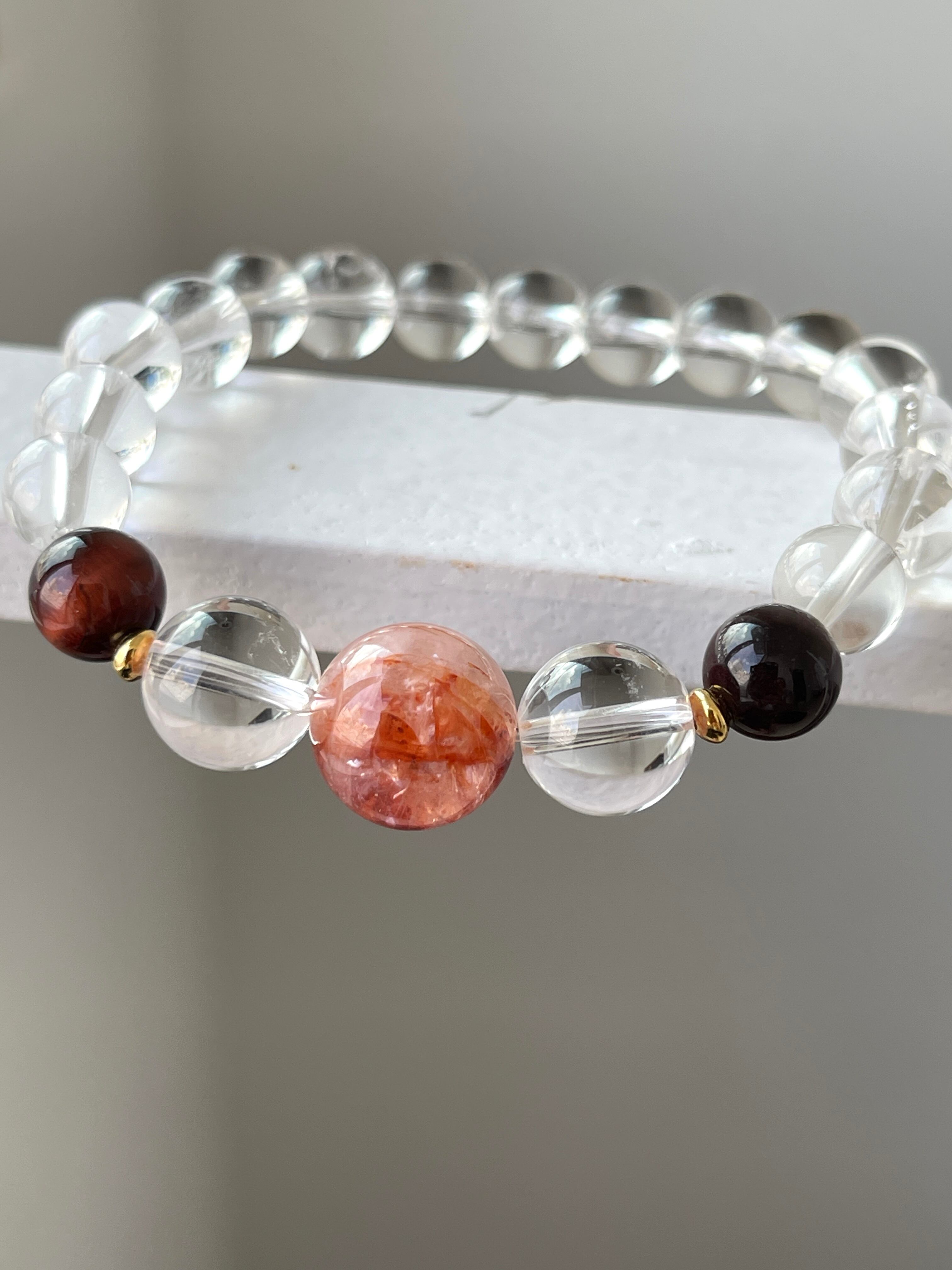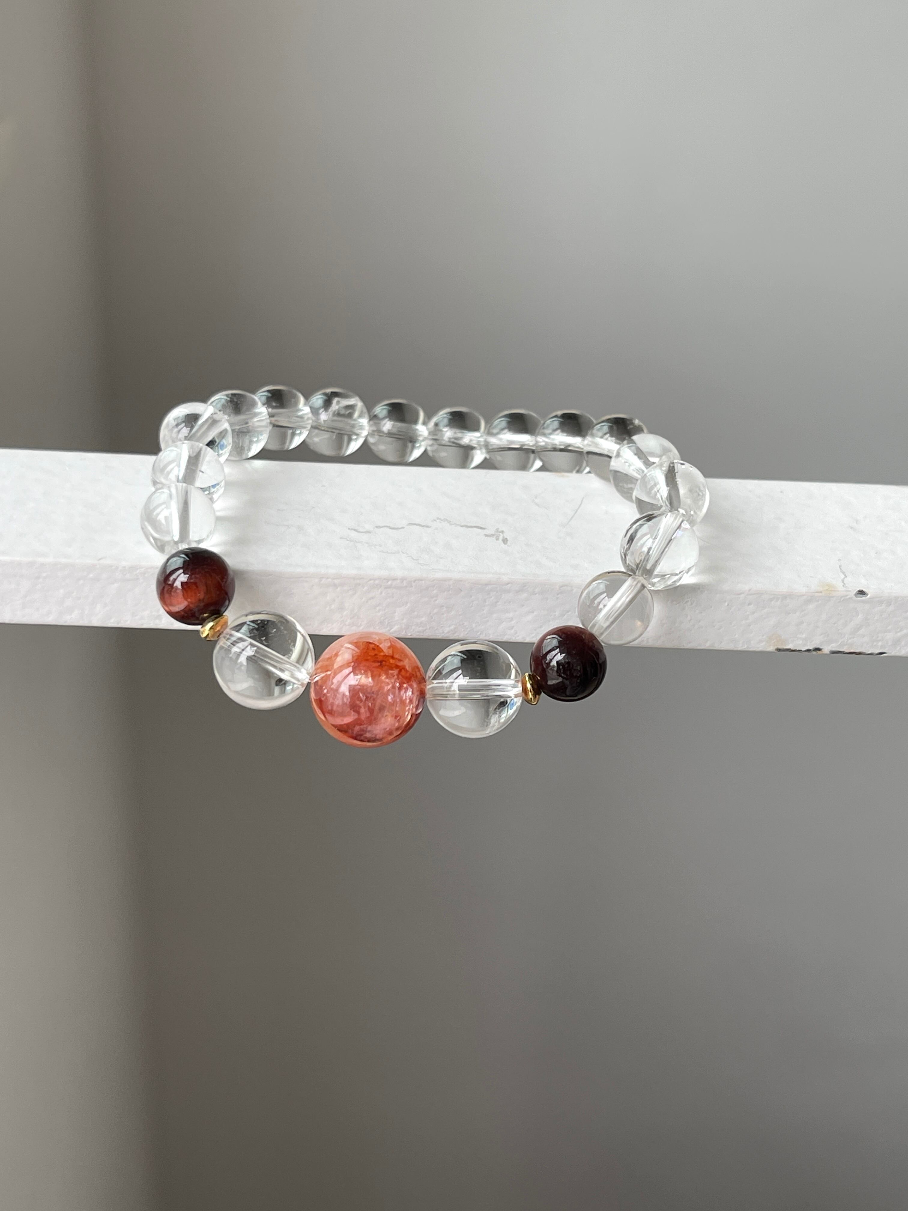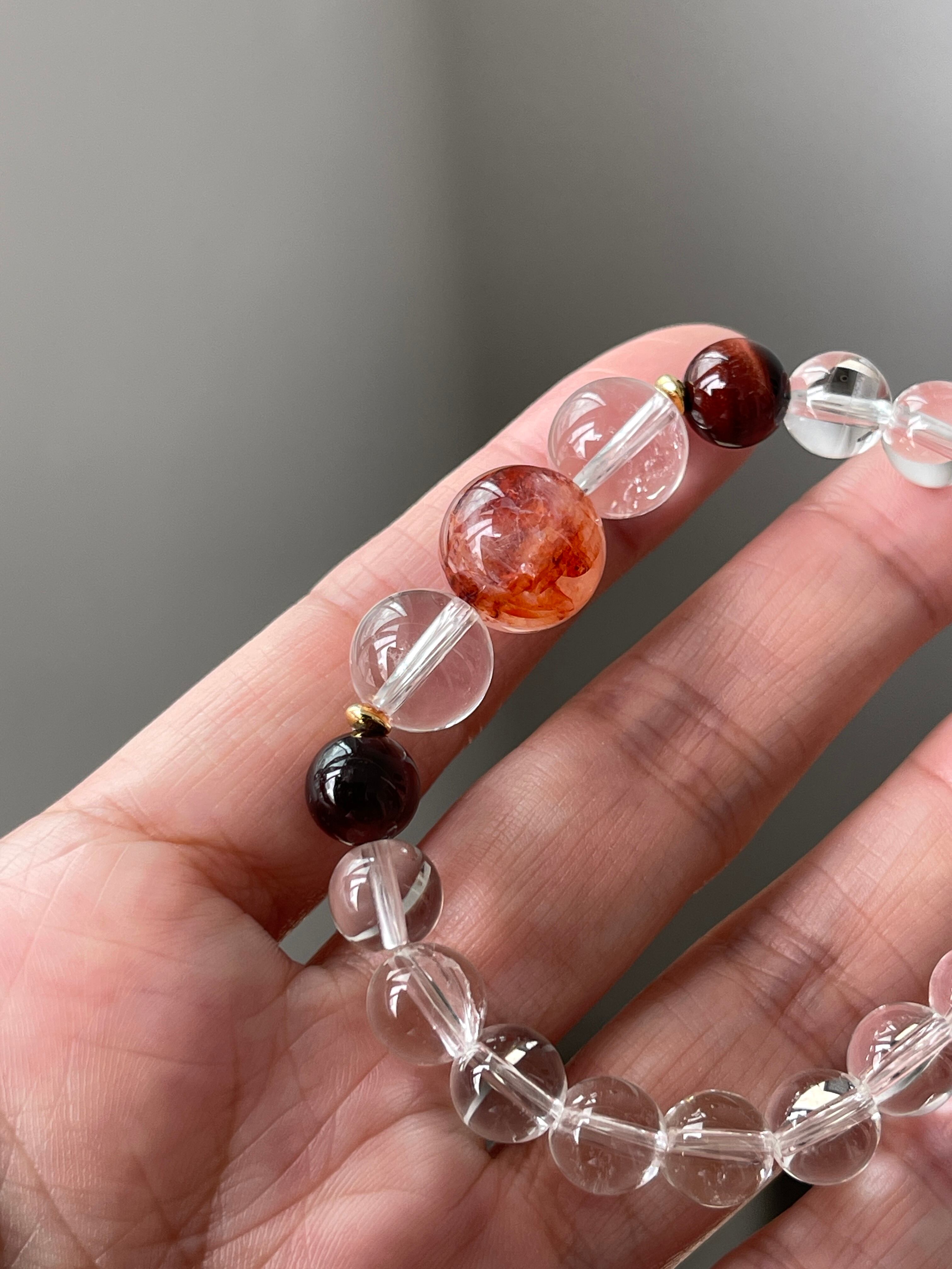 レッドタイガーアイそして天然水晶が贅沢に組み合わされ、穏やかで強力なエネルギーを放ちます。