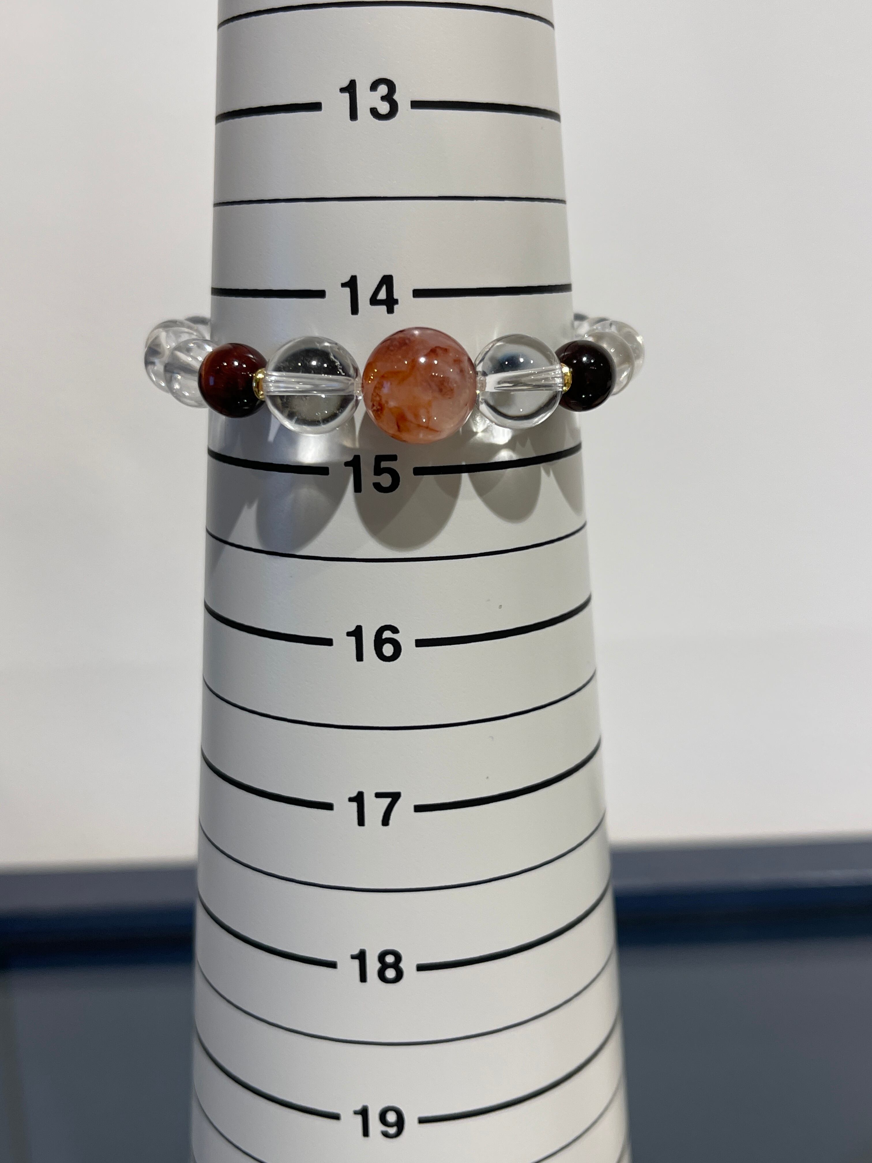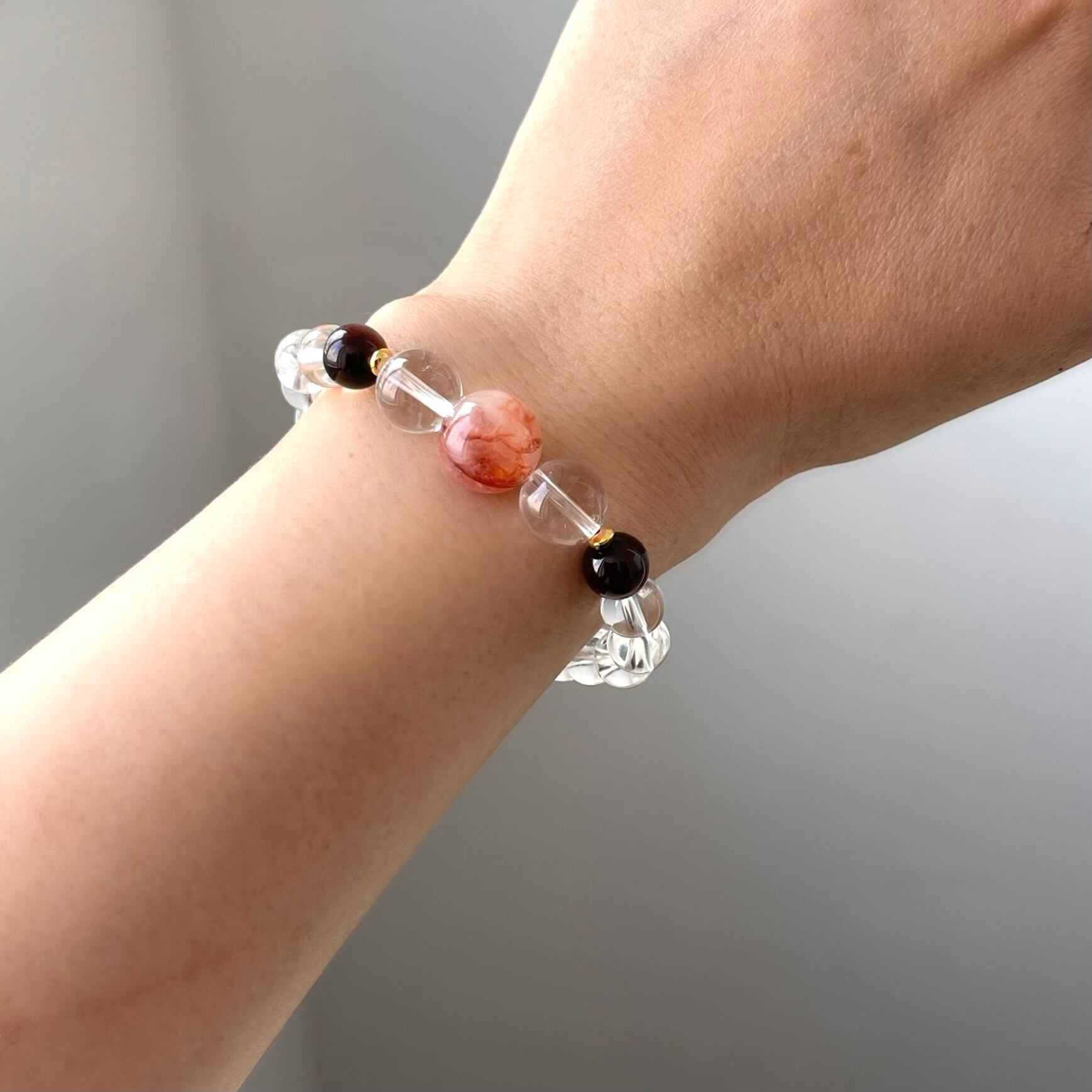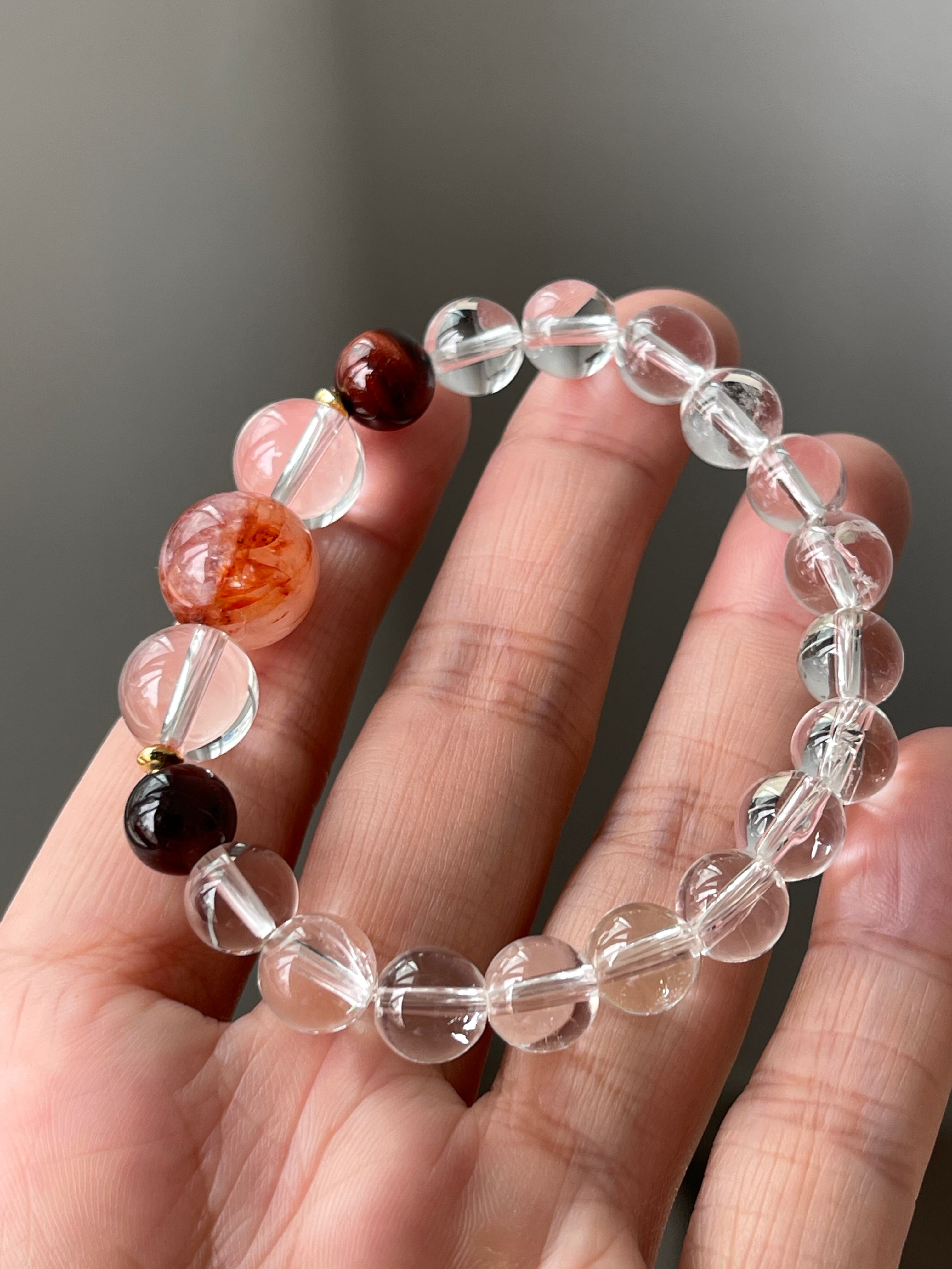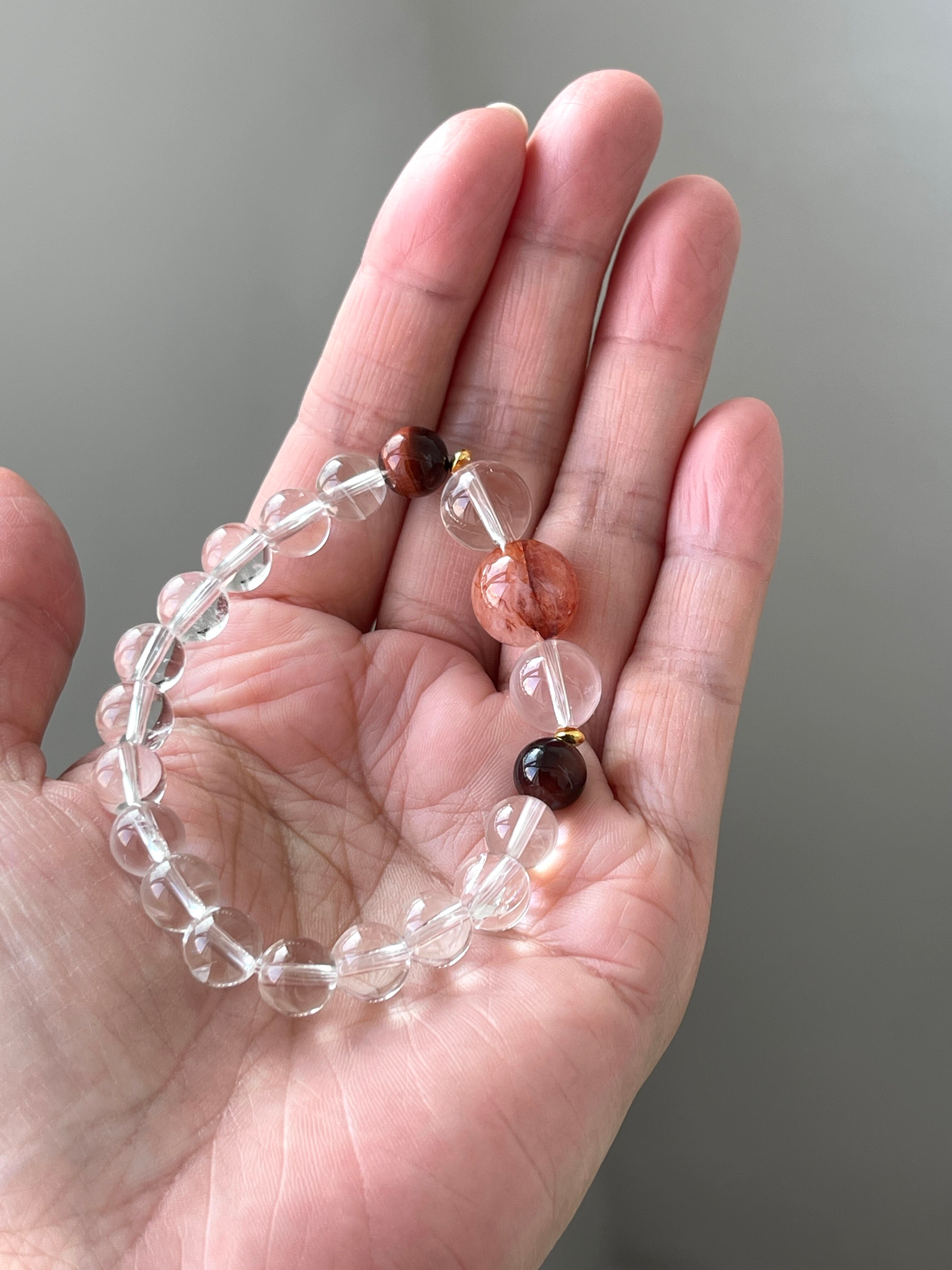レッドタイガーアイそして天然水晶が贅沢に組み合わされ、穏やかで強力なエネルギーを放ちます。