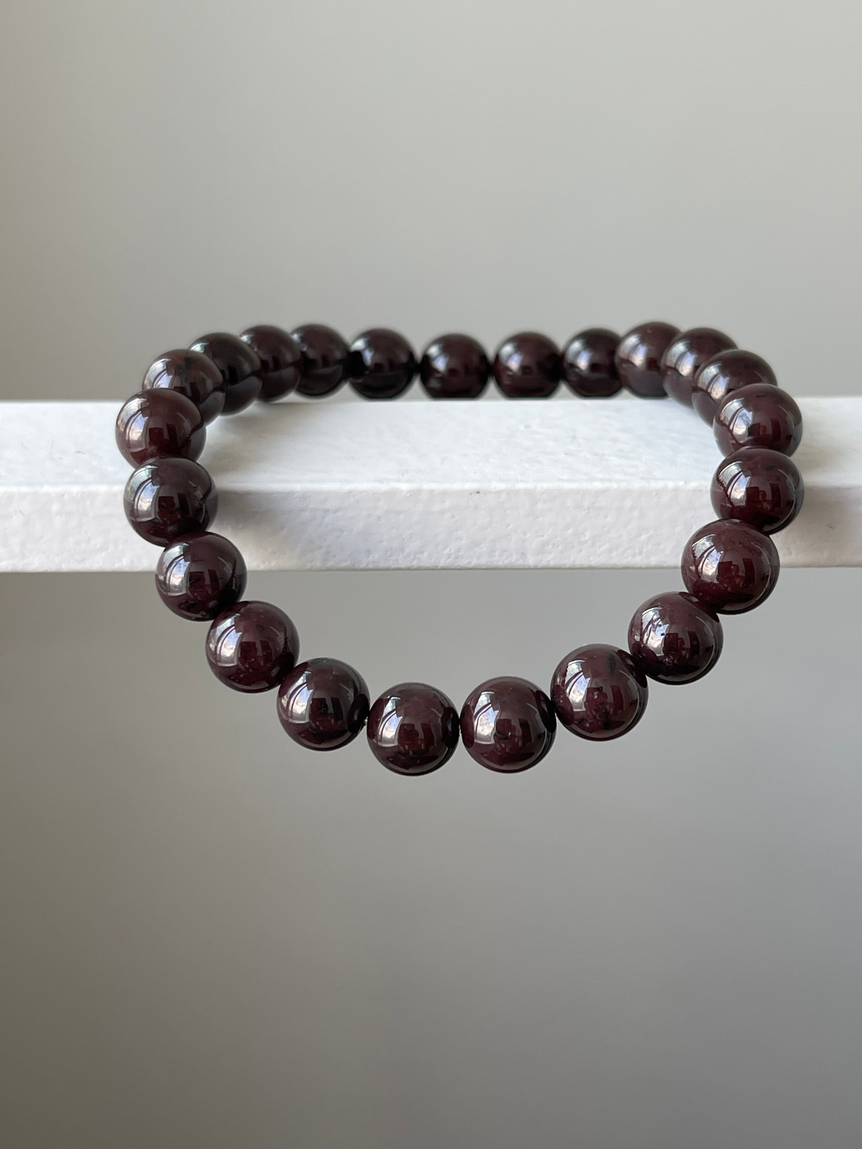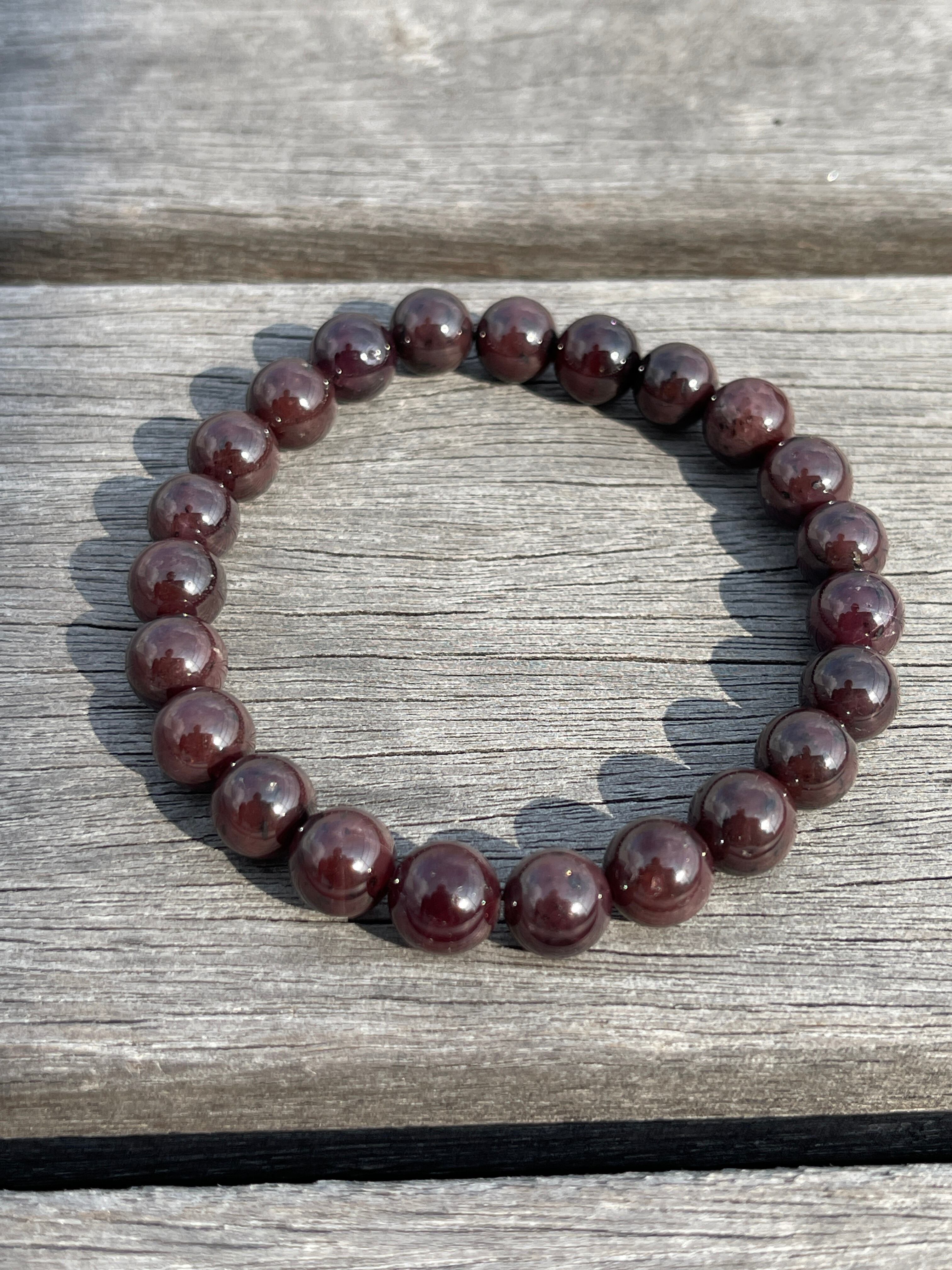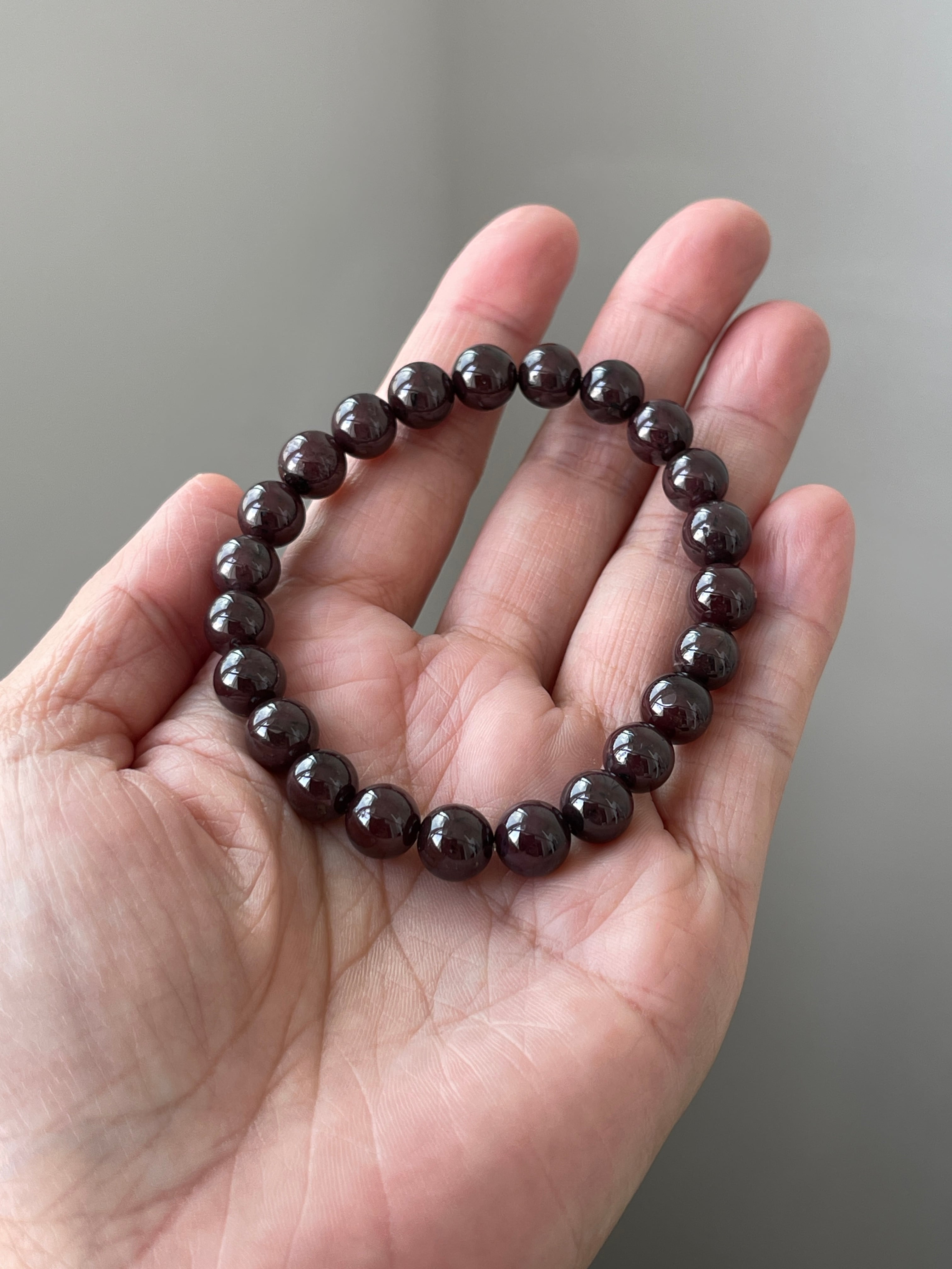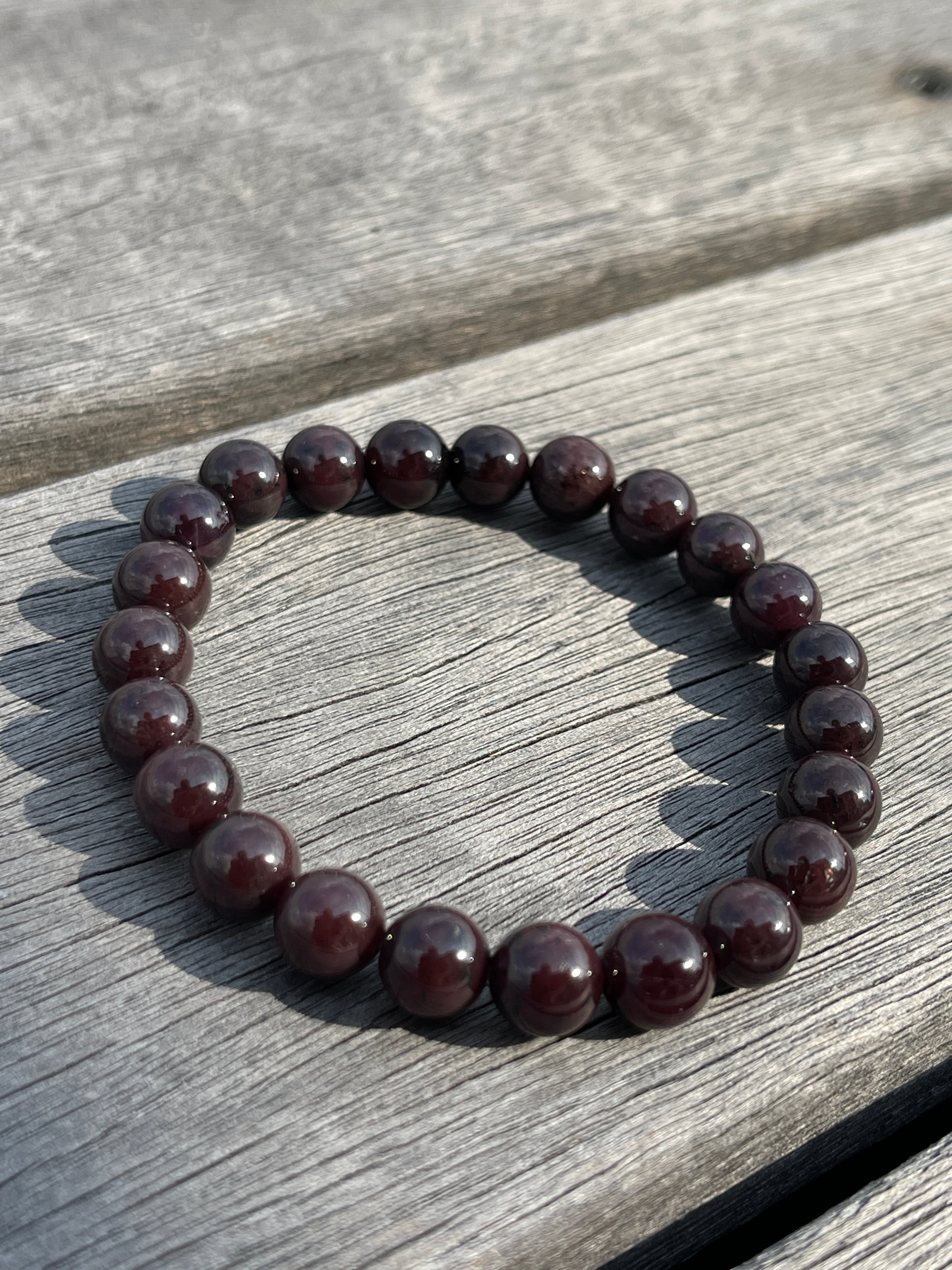 ブラジル産スターガーネットのパワーストーンブレスレットです。 ペンライトを当てるとスター効果が見られ、程度差はありますが、多くの粒から4条または6条の光のラインが確認できます。