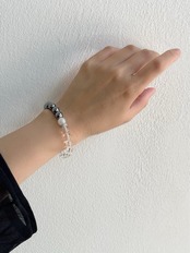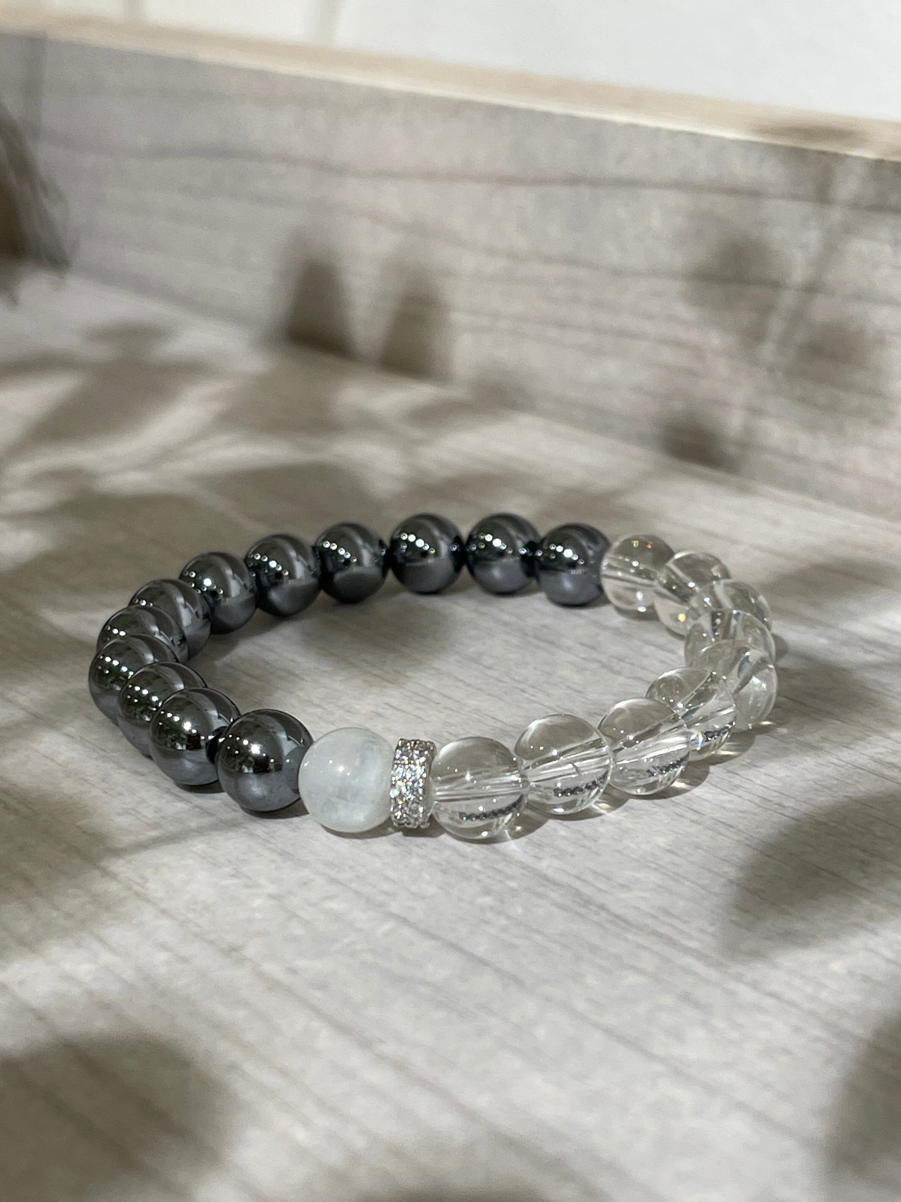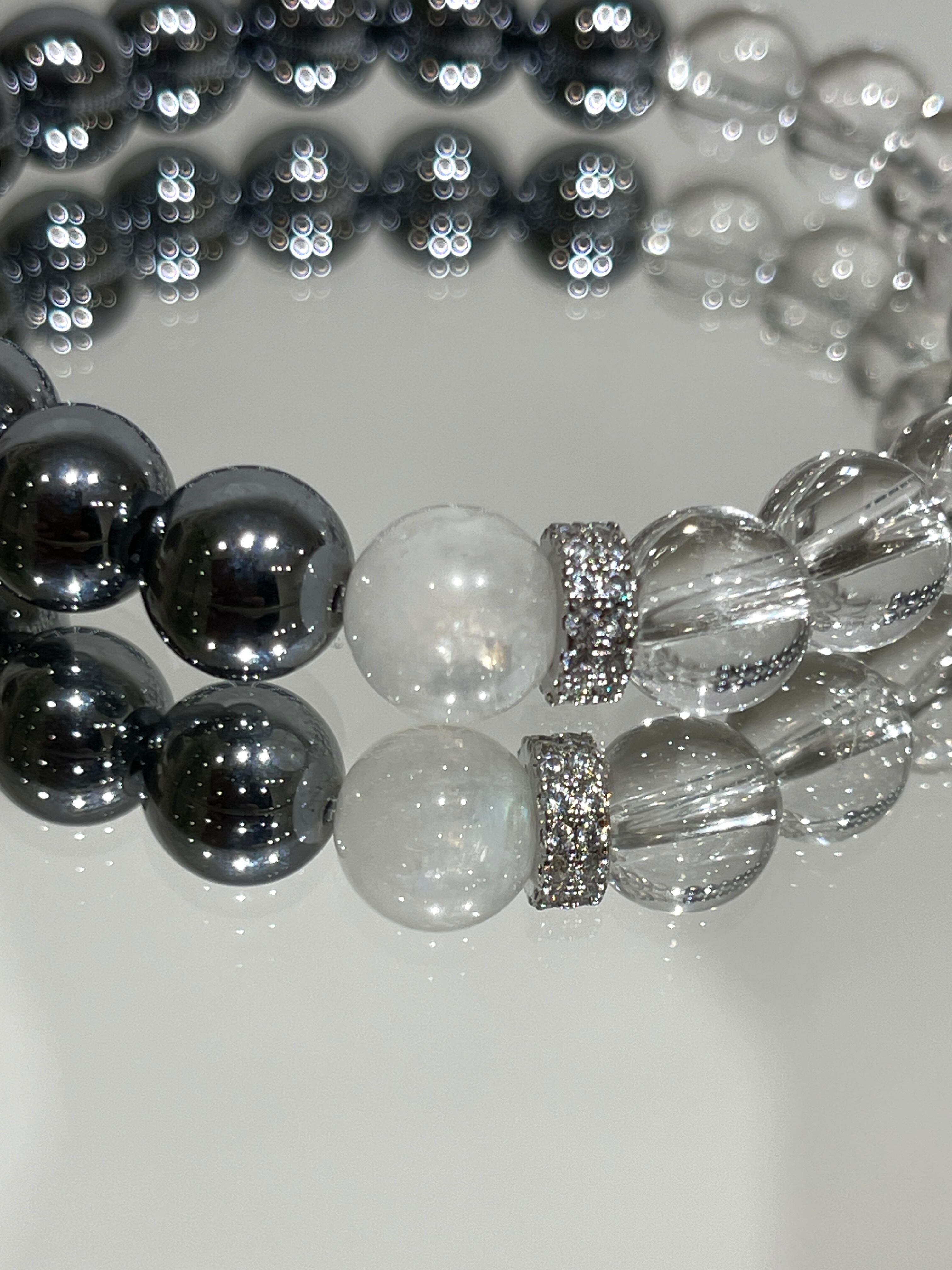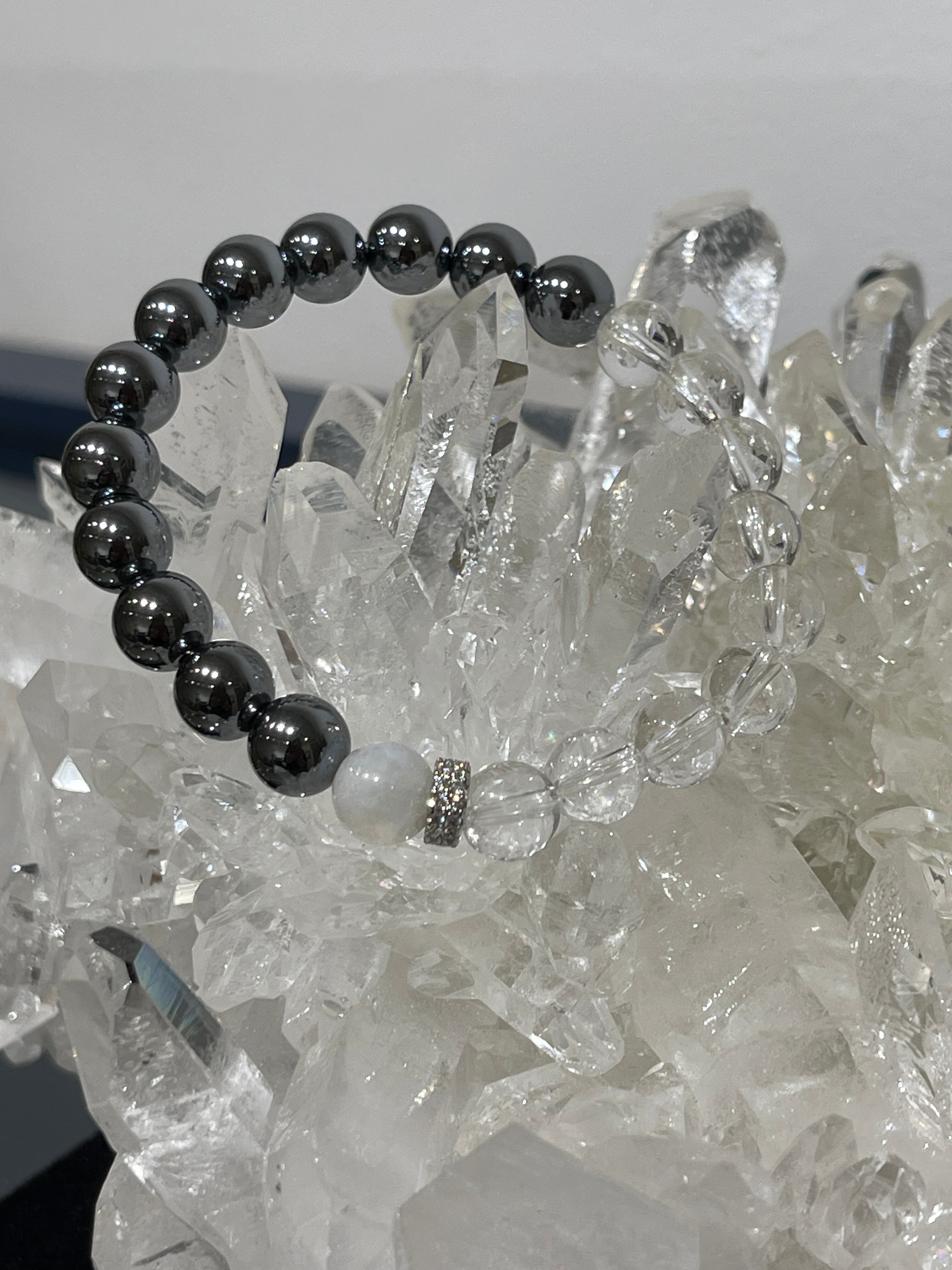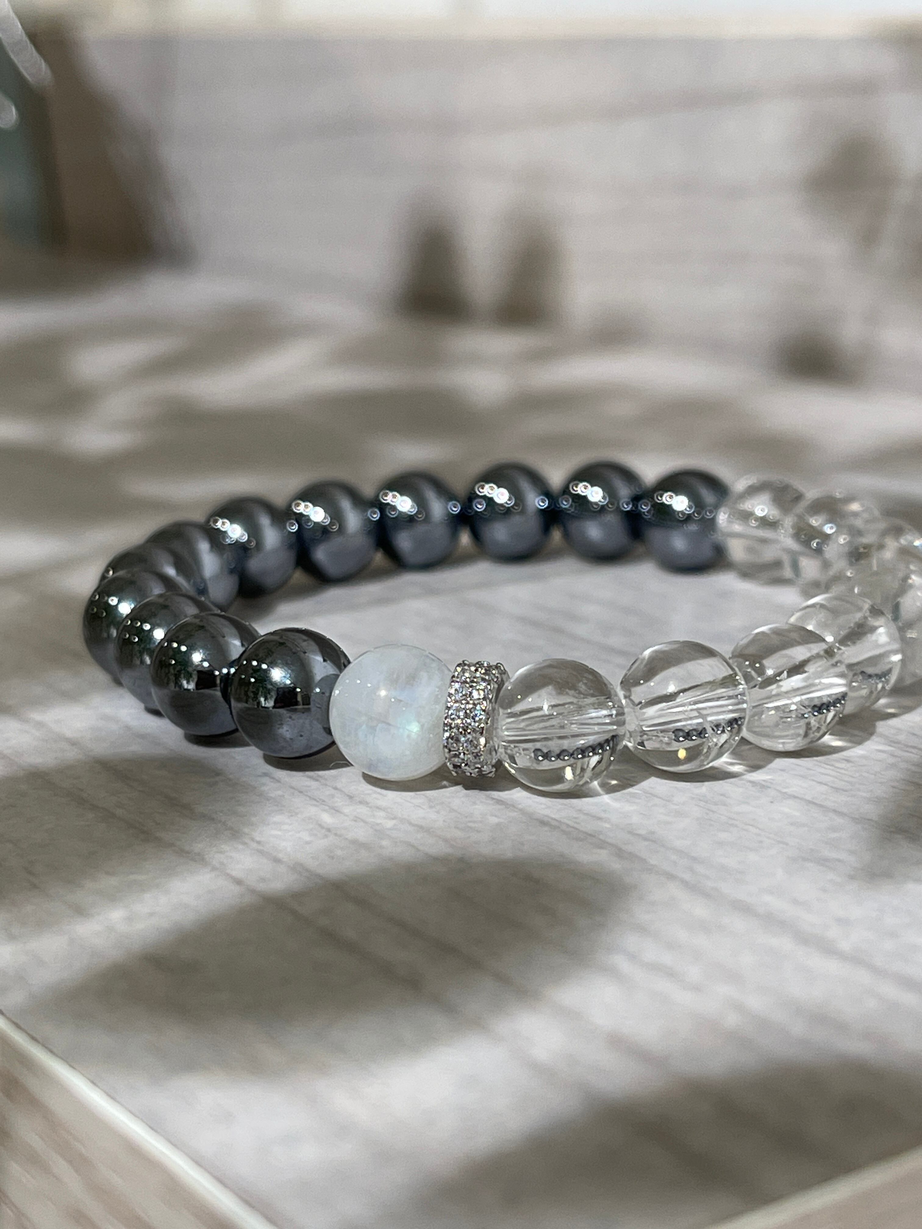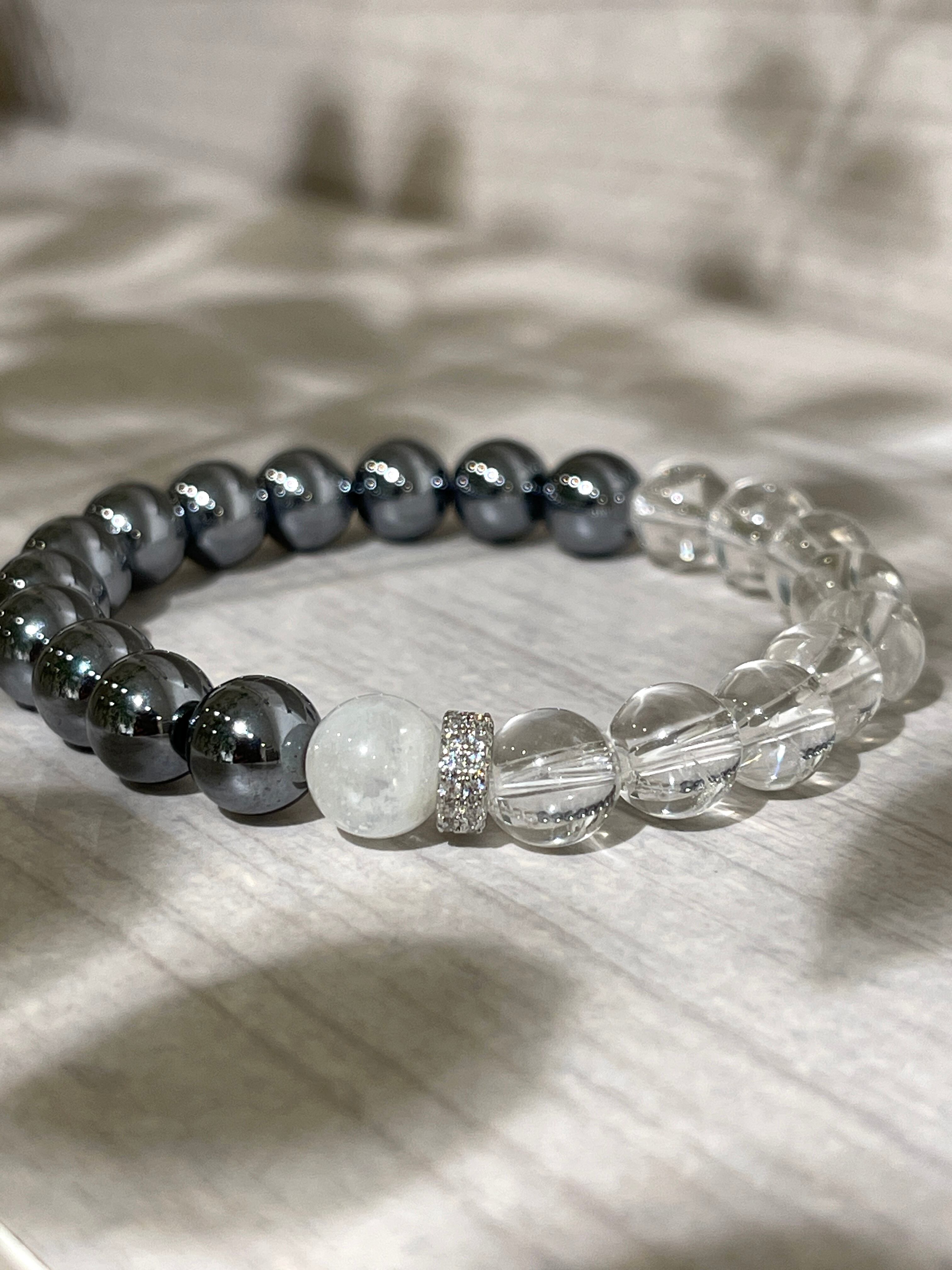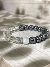 テラヘルツと天然水晶のパワーストーンブレスレットです。アクセントにレインボームーンストーン1石とキラキラ輝くジルコニアのパーツを組み合わせました。