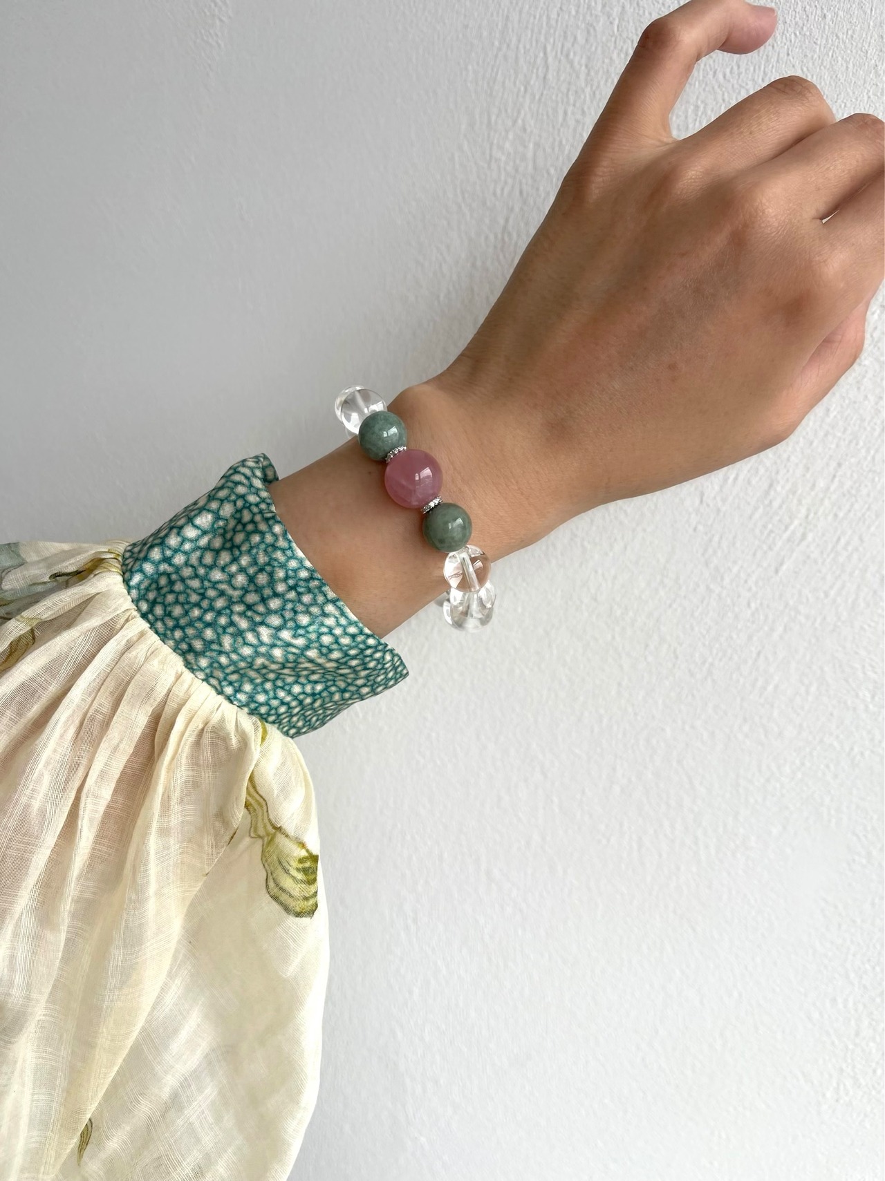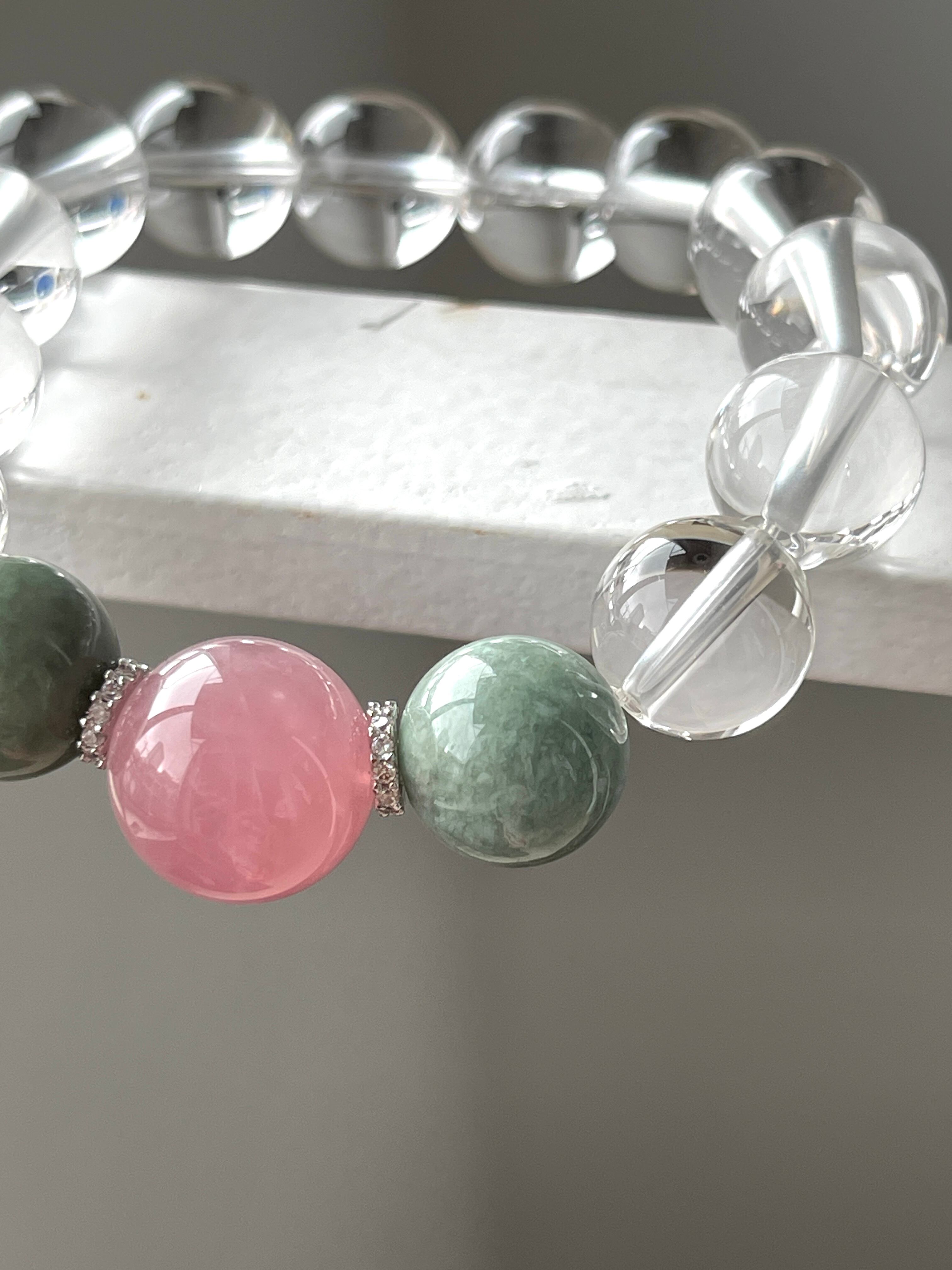 ハートチャクラを活性化し、愛情や癒しを促すディープローズクォーツと、幸福と調和をもたらすビルマ産翡翠を組み合わせたパワーストーンブレスレット。