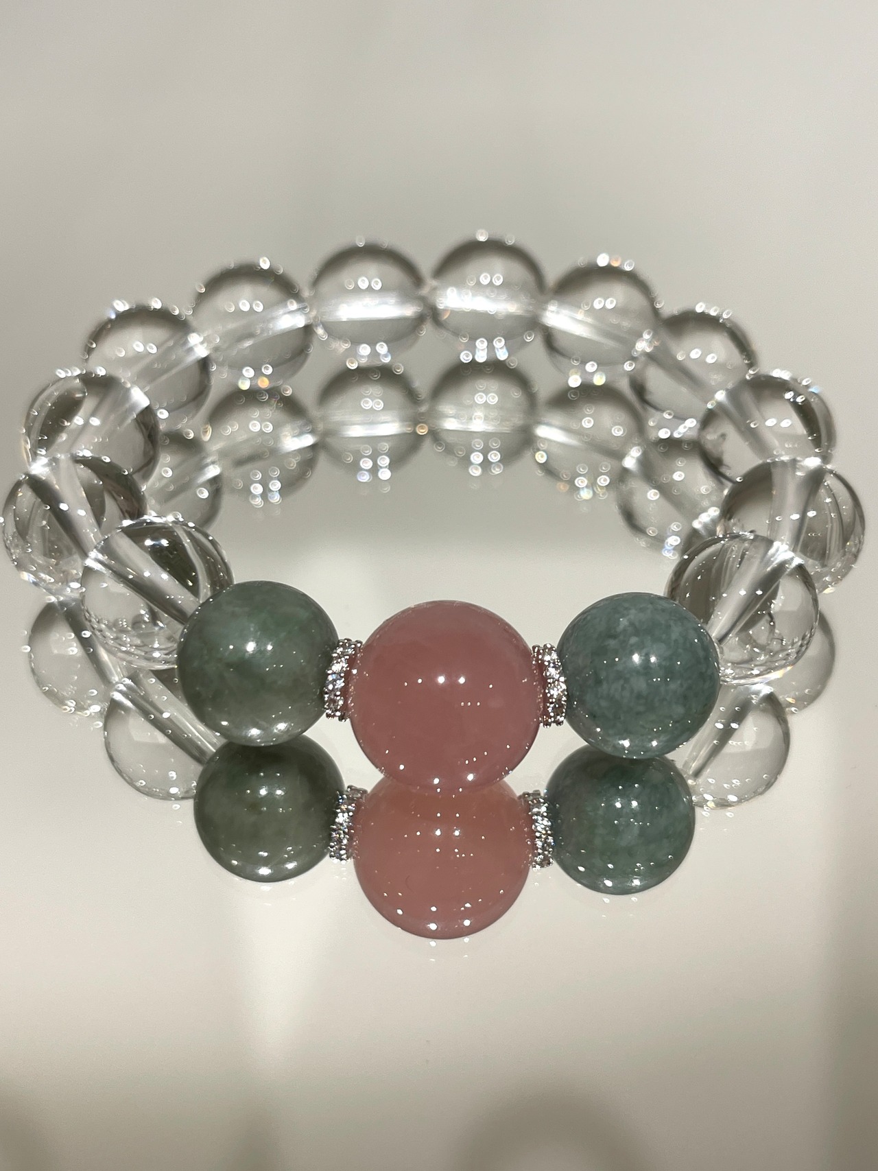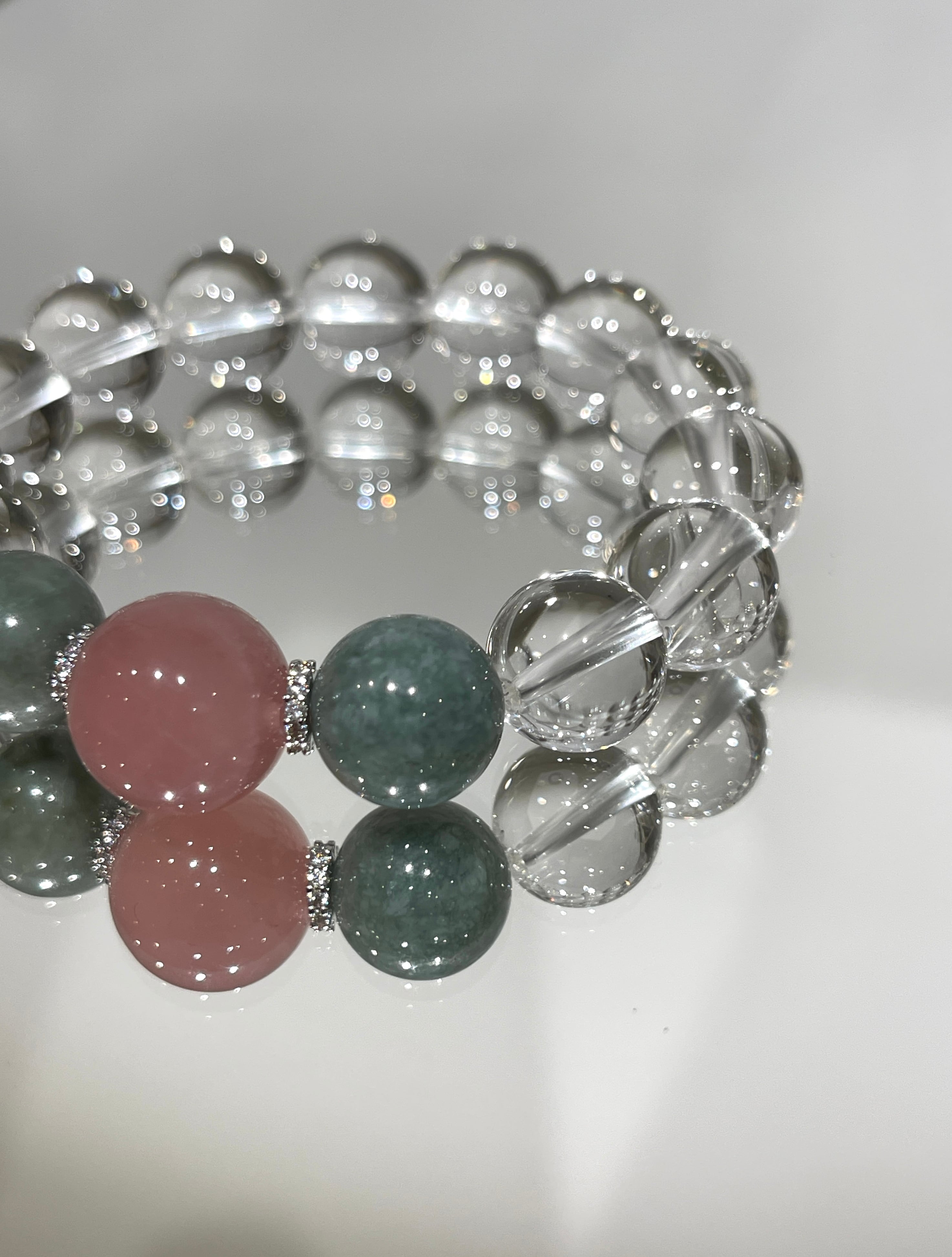 ビルマ産翡翠(12ミリ珠)、天然水晶(12ミリ珠)