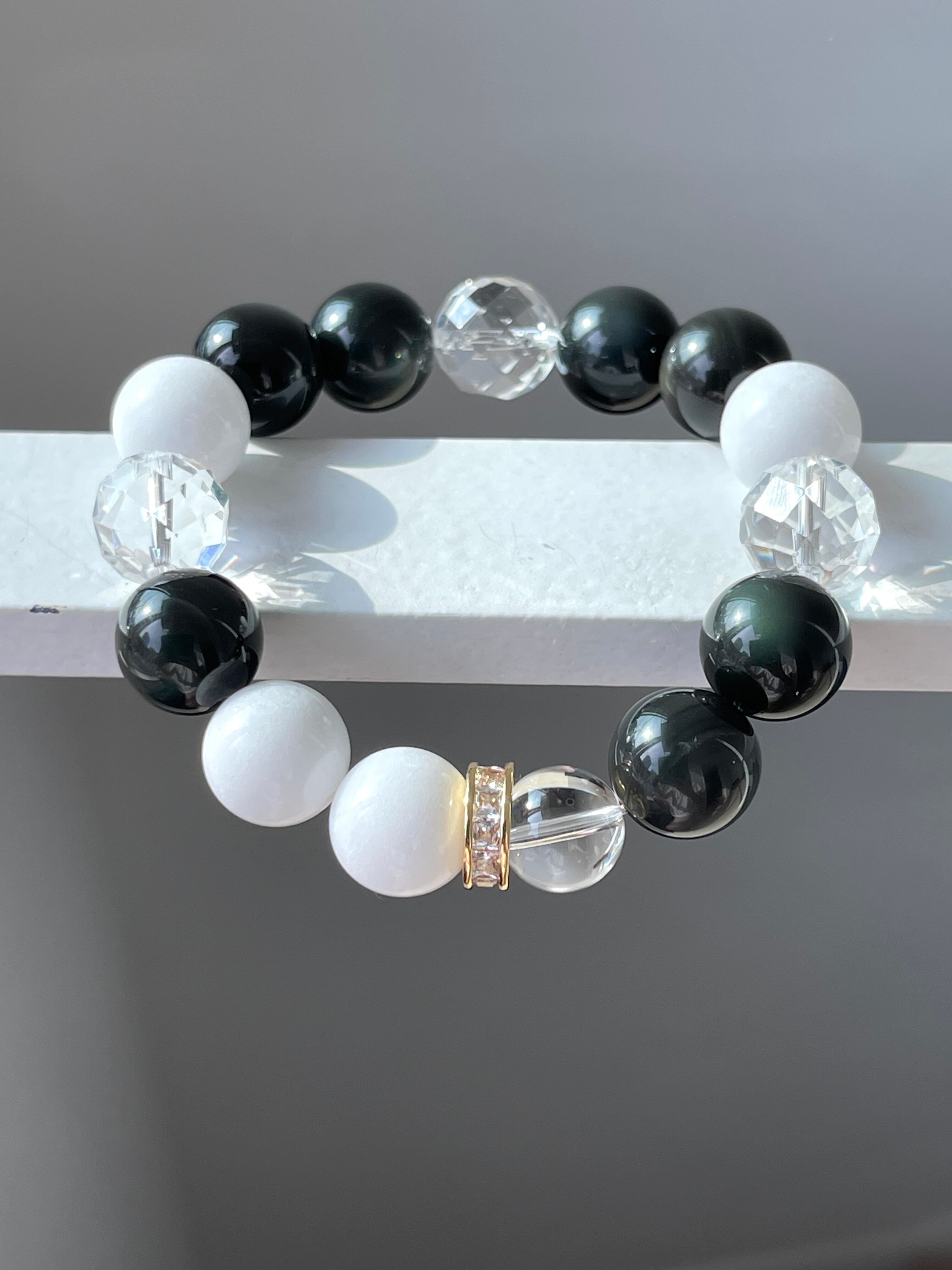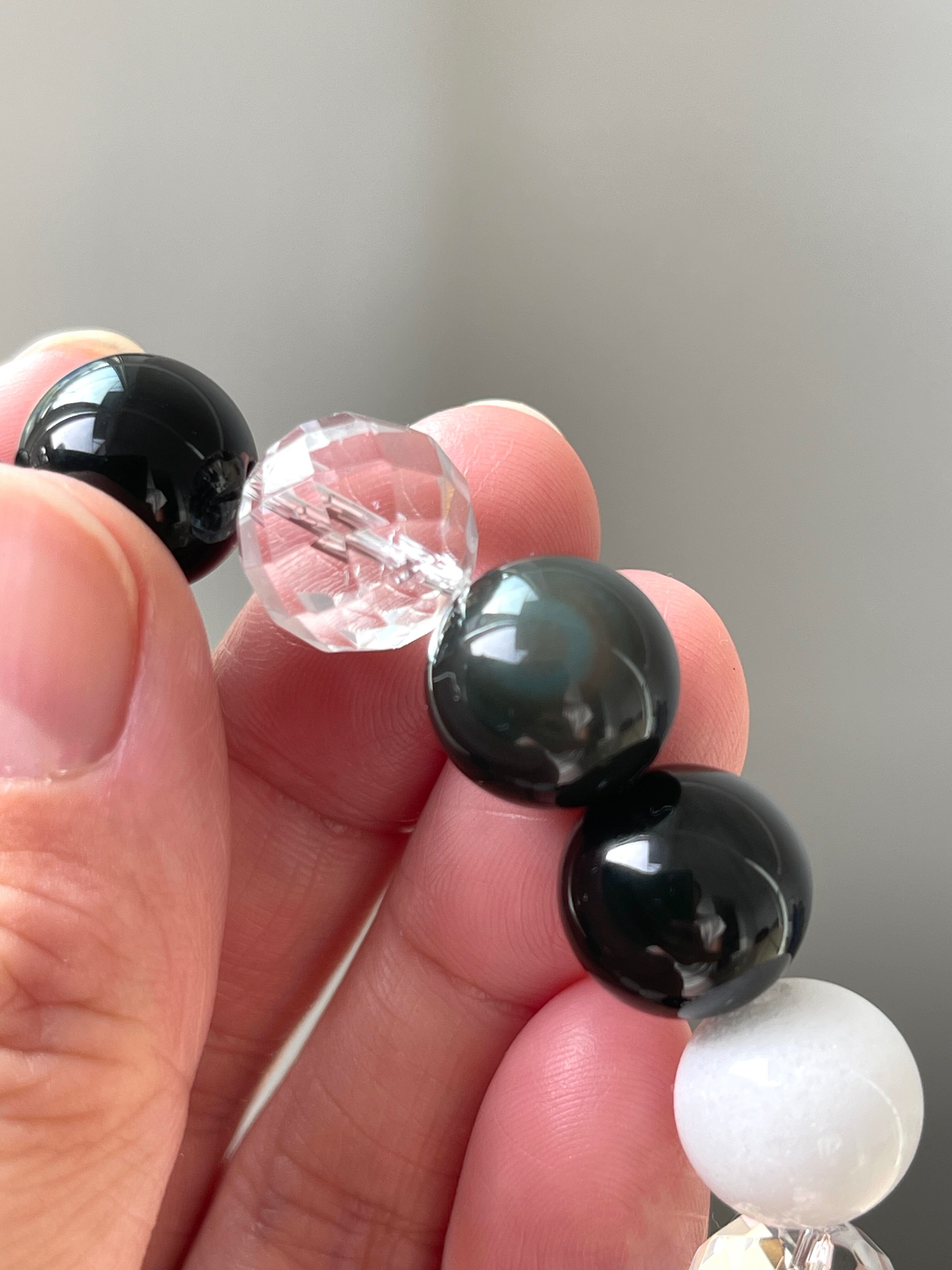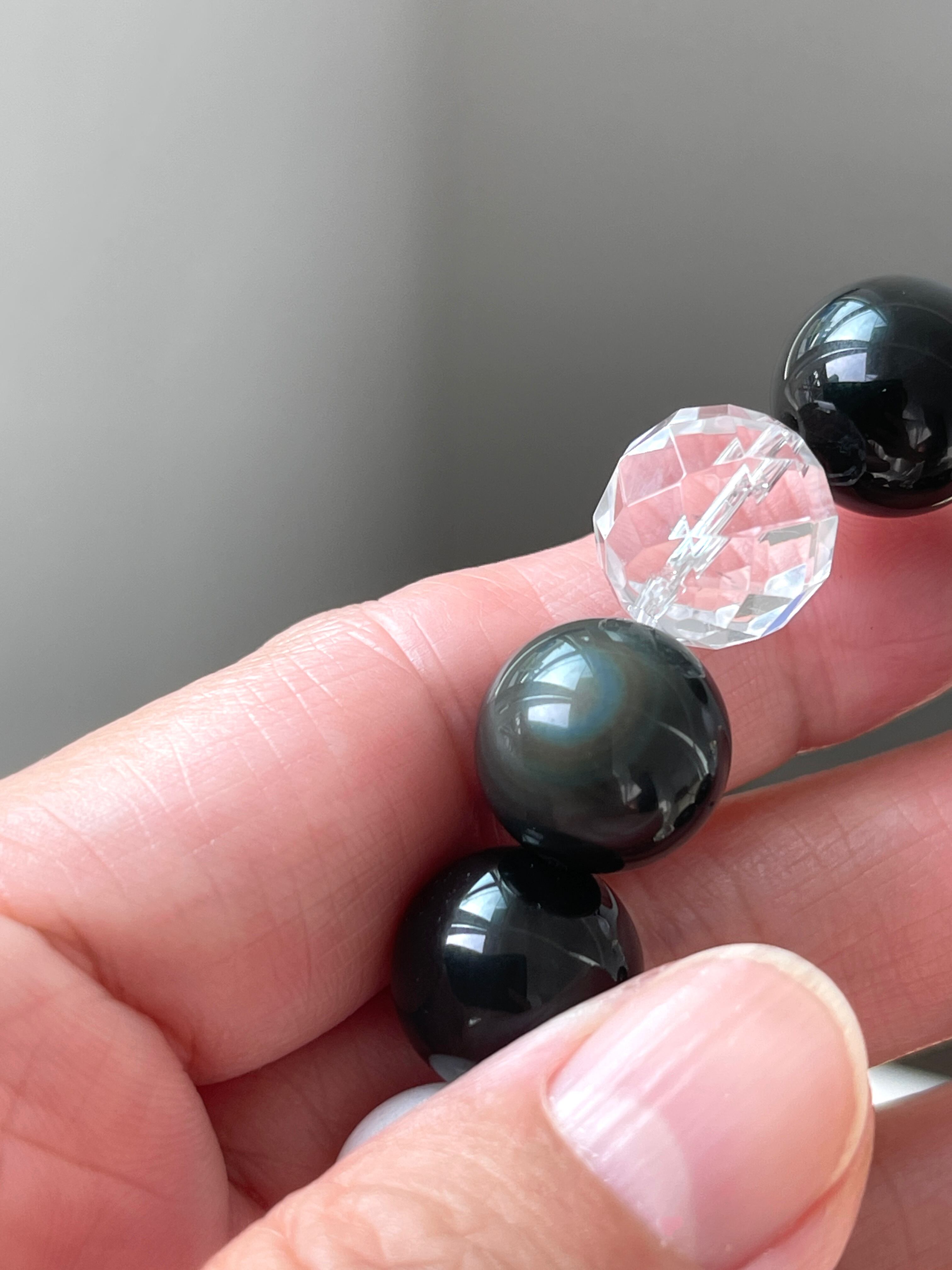 美しいカットが施された水晶は身につけと一瞬で次元上昇したかのような感覚、見るものや感じ方まで変わってしまう波動で、ホワイトジェイド、レインボーオブシディアンの効果を更に引き出しサポートします。