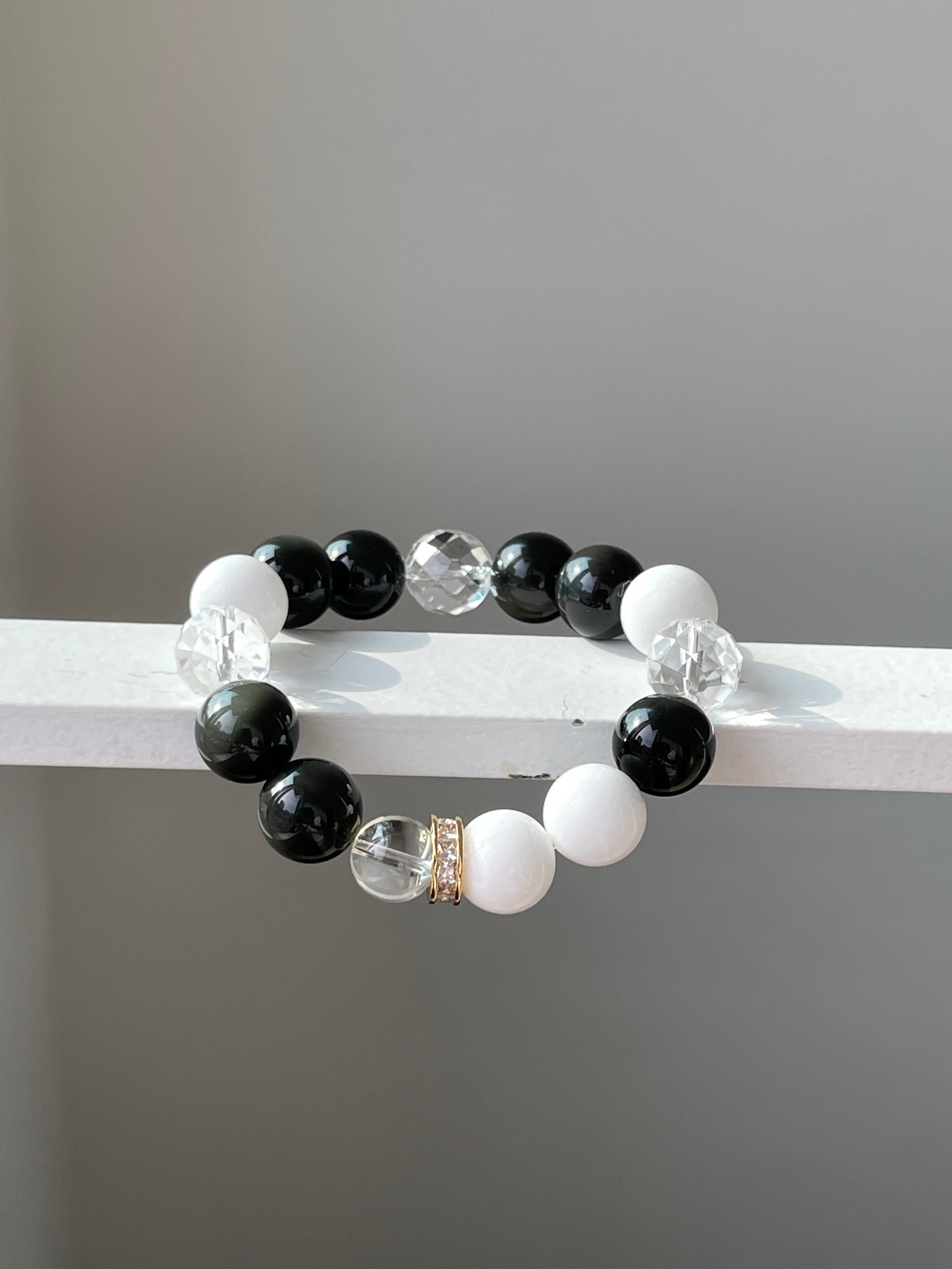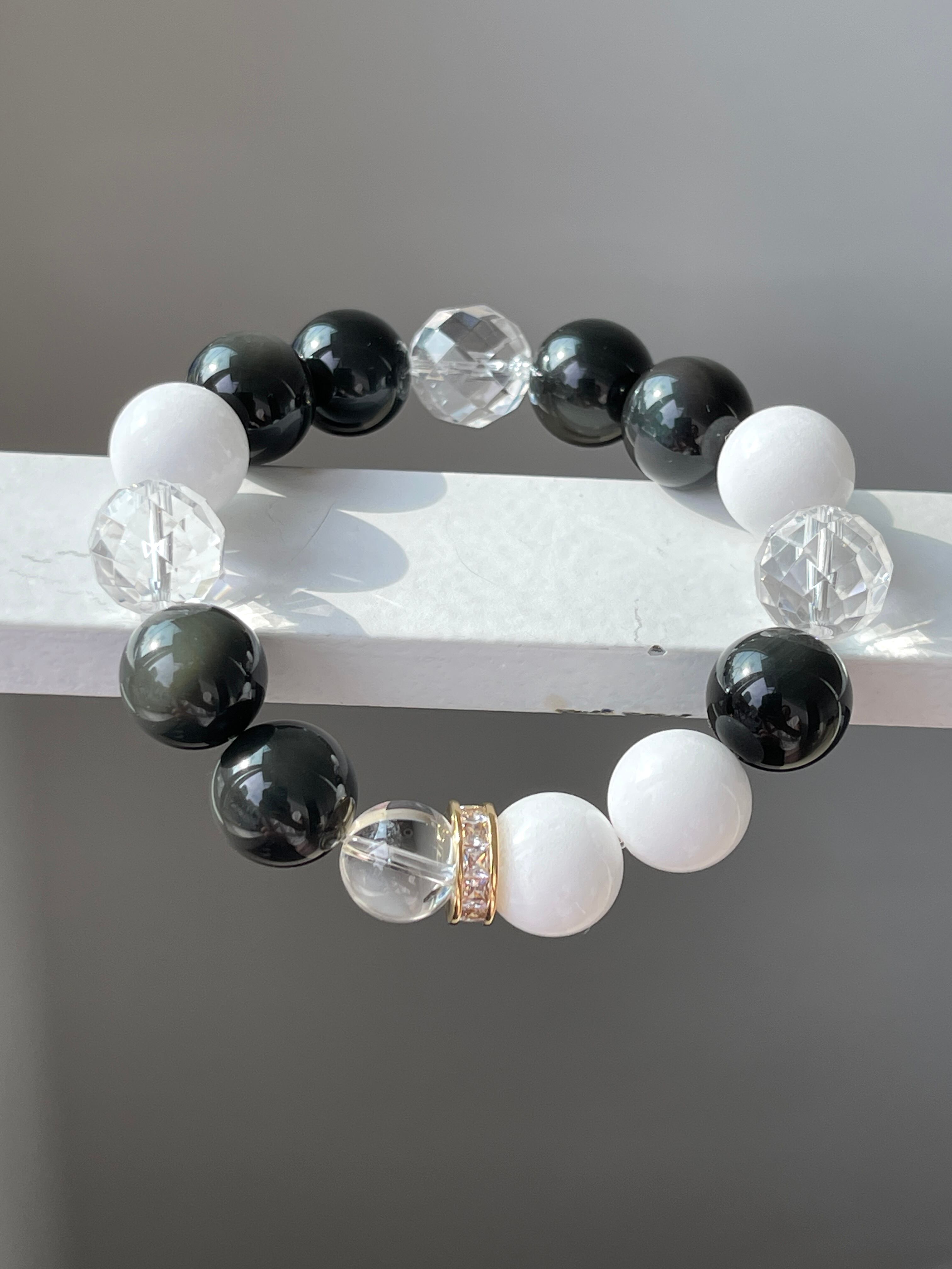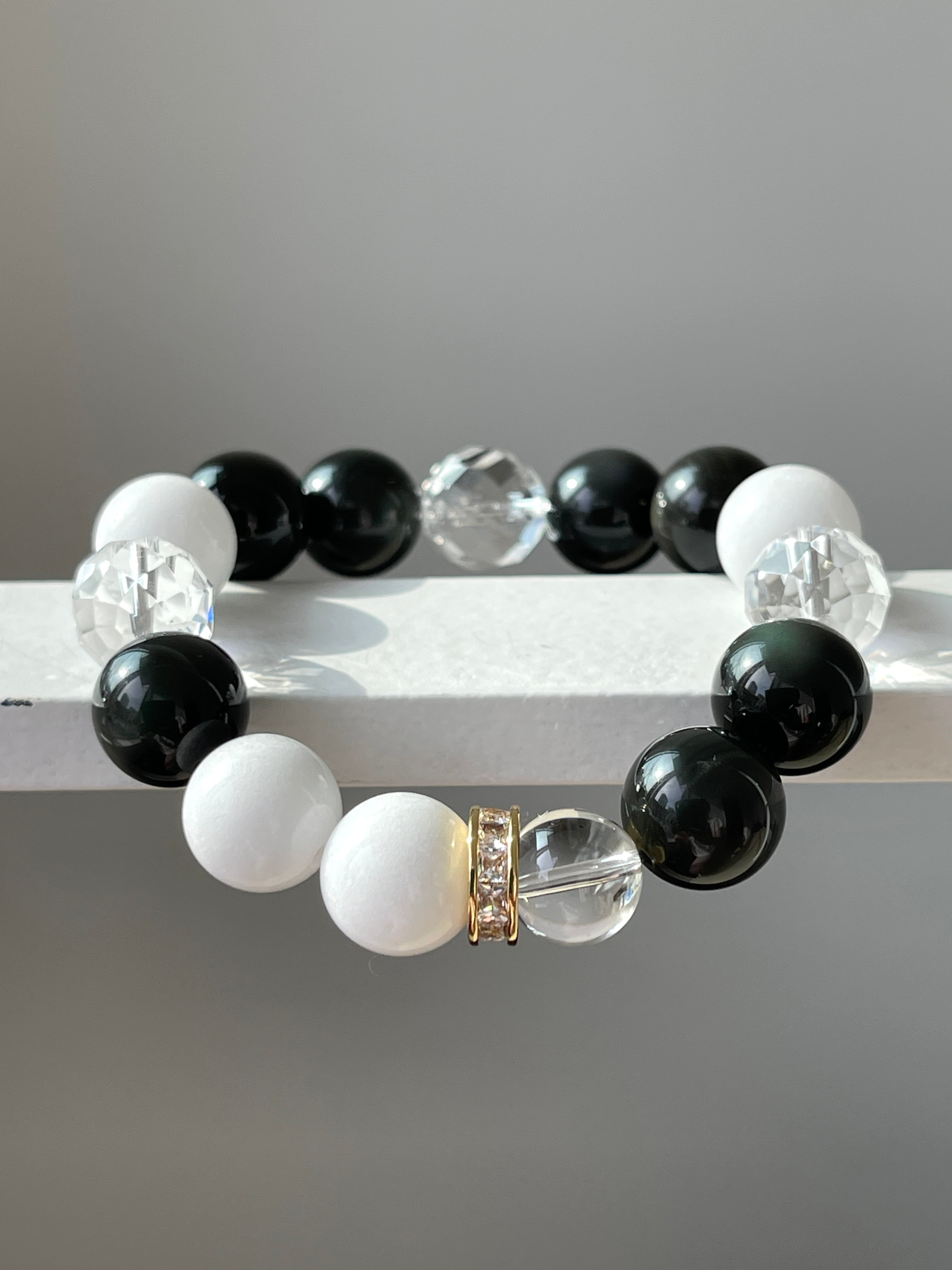 美しいカットが施された水晶は身につけと一瞬で次元上昇したかのような感覚、見るものや感じ方まで変わってしまう波動で、ホワイトジェイド、レインボーオブシディアンの効果を更に引き出しサポートします。